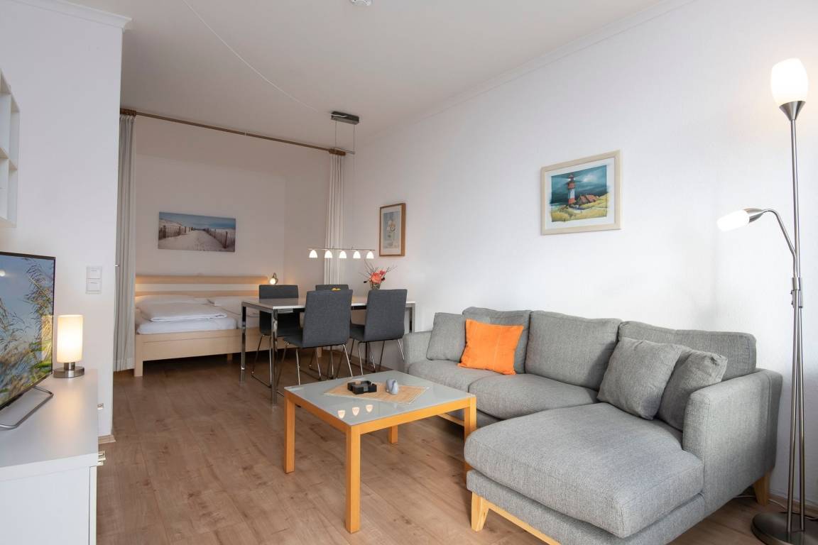 So schön kann Urlaub sein! Die gemütliche Eck-Wohnung wird Sie sofort begeistern. Der Wohn-/Schlafbereich ist durchdacht aufgeteilt: Entspannen Sie auf der Couch vor dem TV-Gerät oder treten Sie auf den möblierten Balkon und genießen Sie die gute Ostseeluft. Hier können Sie zum Beispiel wunderbar in der Morgensonne frühstücken, aber auch sonst lockt die kuschelige Sitzecke im Freien. Für die Nacht steht im hinteren Bereich ein Doppelbett (2x 90x200 cm) für Sie bereit, das man durch lange Vorhänge optisch abtrennen kann. Das separate Schlafzimmer verfügt über ein Einzelbett (90x200 cm) und einer kleinen Leseecke. Die moderne Küche ist gut ausgestattet und ermöglicht es Ihnen, sich im Urlaub gut selbst zu versorgen. Das schöne Bad mit großer Dusche (70x140 cm) ist hell gefliest.