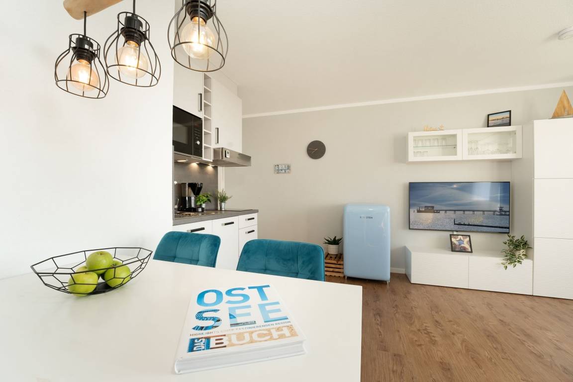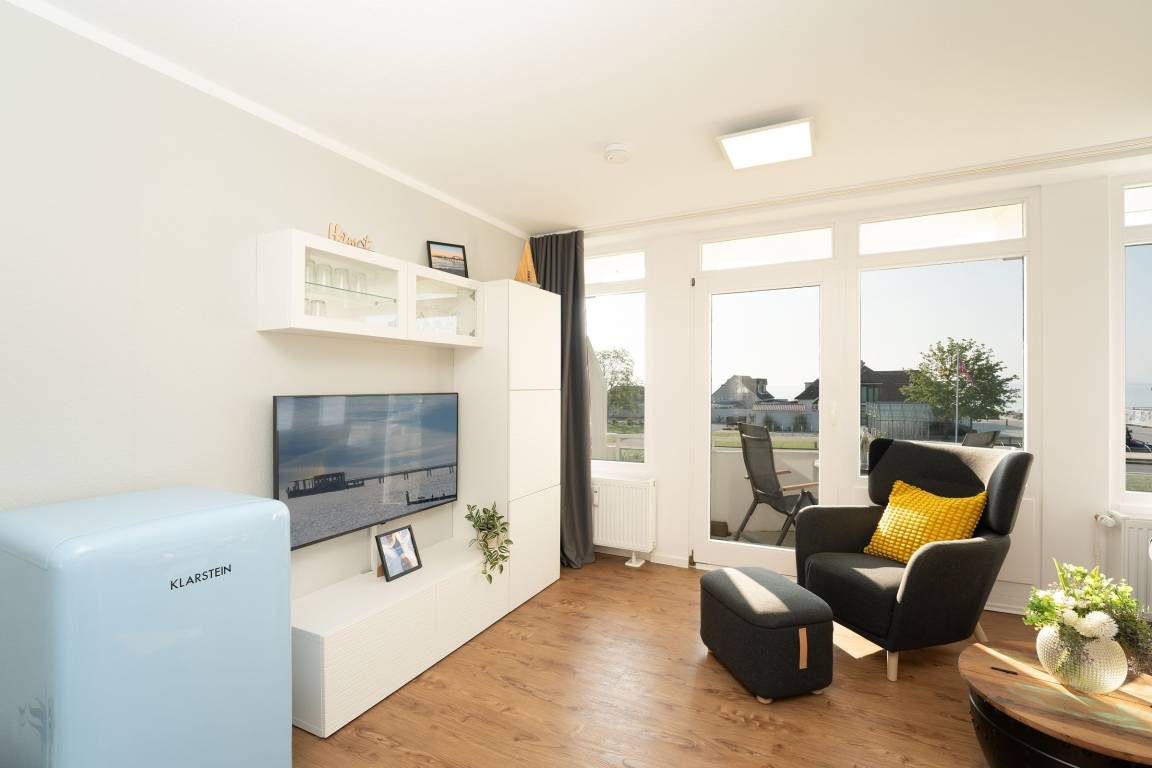 Aufwachen und auf die Ostsee schauen - Das können Sie in dieser schönen Ferienunterkunft im Haus Seeblick. Die Wohnung bietet ein schönes Wohnzimmer mit Couch, Sessel und einem Smart-TV und eine kleine, zum Wohnzimmer integrierte moderne Einbauküche nebst Esstisch mit Stühlen. Im Schlafzimmer können Sie es sich im Doppelbett (2x 90x200 cm) vor dem 2. Fernseher gemütlich machen. Die Fenster lassen sich hier durch ein Rollo angenehm abdunkeln. Das moderne Badezimmer ist mit einer Dusche ausgestattet. Vom Balkon aus können Sie das Rauschen des Meeres hören. Ein kostenfreier WLAN-Anschluss ist natürlich vorhanden.