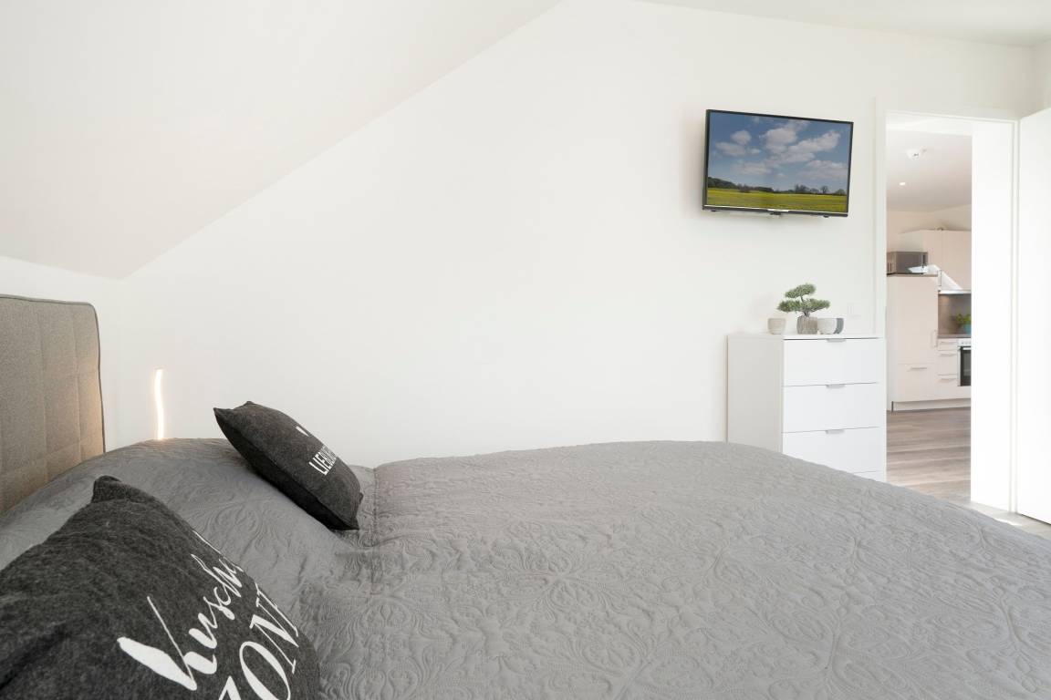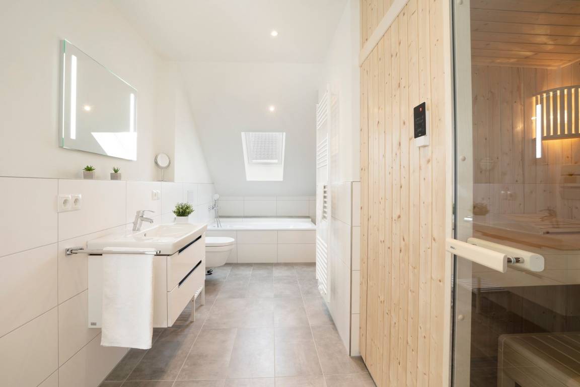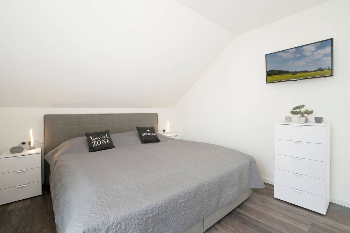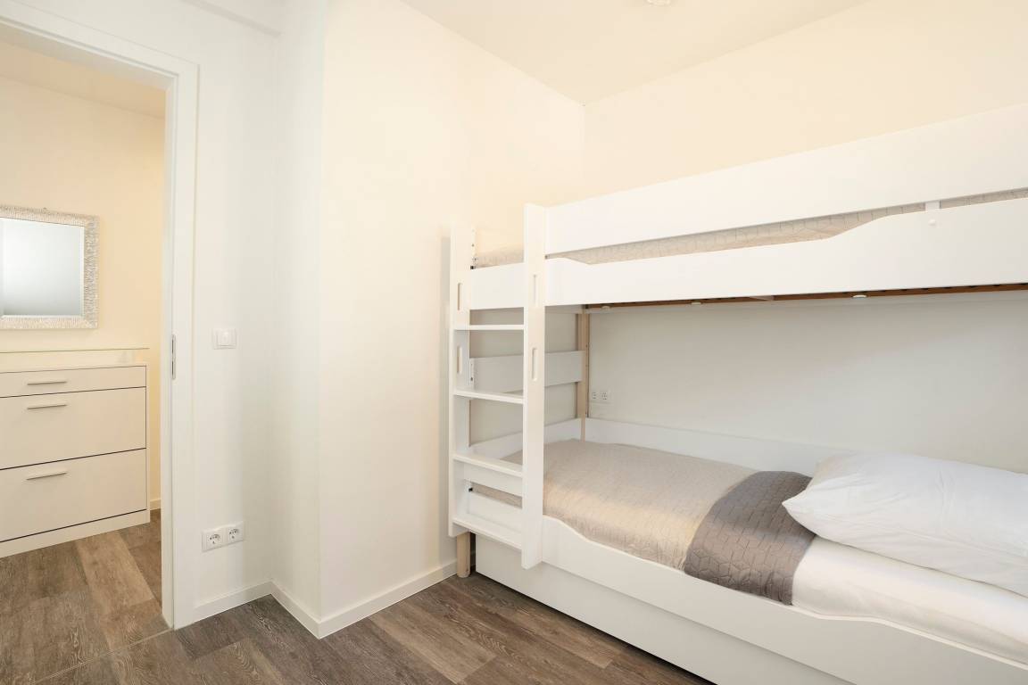 Eines der beiden separaten Schlafzimmer ist mit einem Boxspring-Doppelbett in Übergröße (2x 100x220 cm) und einem weiteren TV ausgestattet. Ihre Urlaubsgarderobe können Sie problemlos im Kleiderschrank verstauen. Im zweiten Schlafzimmer finden 2 Personen im Etagenbett Platz (je 90x200 cm). Das untere Bett kann mühelos durch eine ausziehbare Matratze um einen dritten Schlafplatz (90x200 cm) erweitert werden. Das voll ausgestattete Badezimmer bietet als Highlight eine eigene Sauna, in der es sich auch an kälteren Tagen herrlich entspannen lässt.