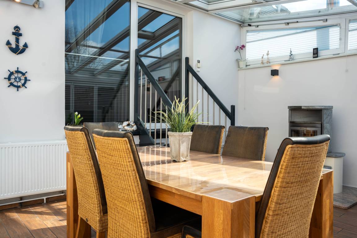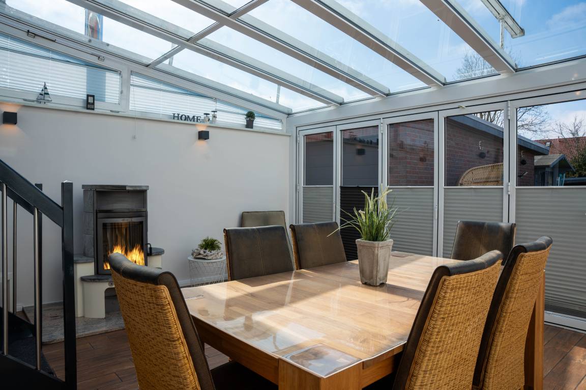 Die moderne, voll ausgestattete Küche und der Essbereich im Wintergarten bieten eine angenehme Atmosphäre zum Kochen und Essen. Der Holzofen sorgt für Gemütlichkeit, während die Schlafräume und das Wohnzimmer mit TV ausgestattet sind, was für Unterhaltung sorgt.