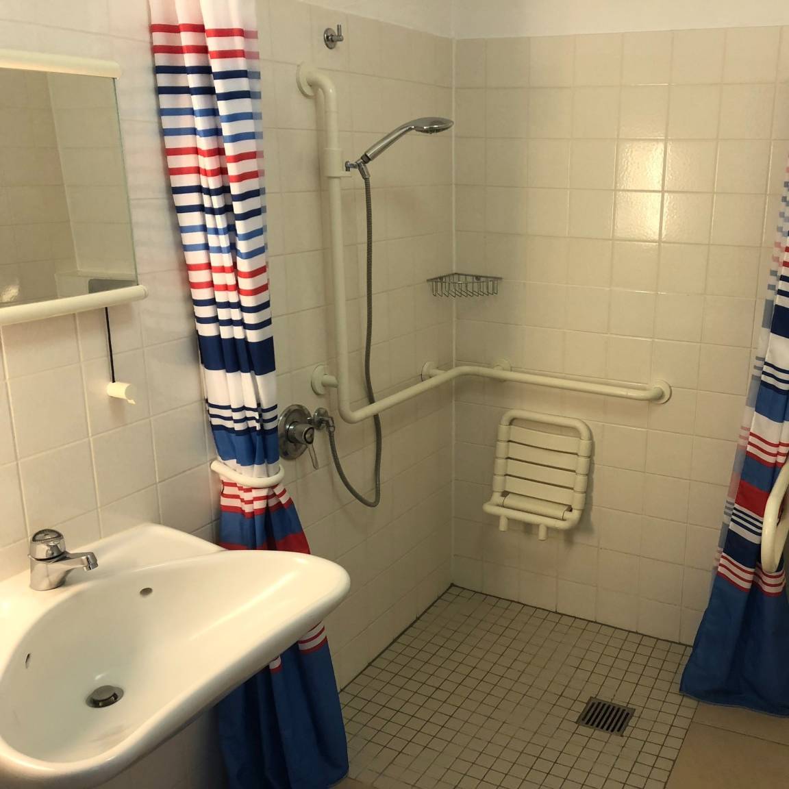 Die Wohnung ist barrierefrei. Das Bad ist behindertengerecht ausgestattet. Die Dusche ist barrierefrei und mit Rollstuhl befahrbar. In Dusche und an WC sind beidseitig Haltegriffe, und zum Duschen gibt es neben dem Klappsitz einen weiteren bequemeren Duschstuhl. Somit ist die Wohnung auch für Menschen mit Gehbehinderung sehr gut geeignet.