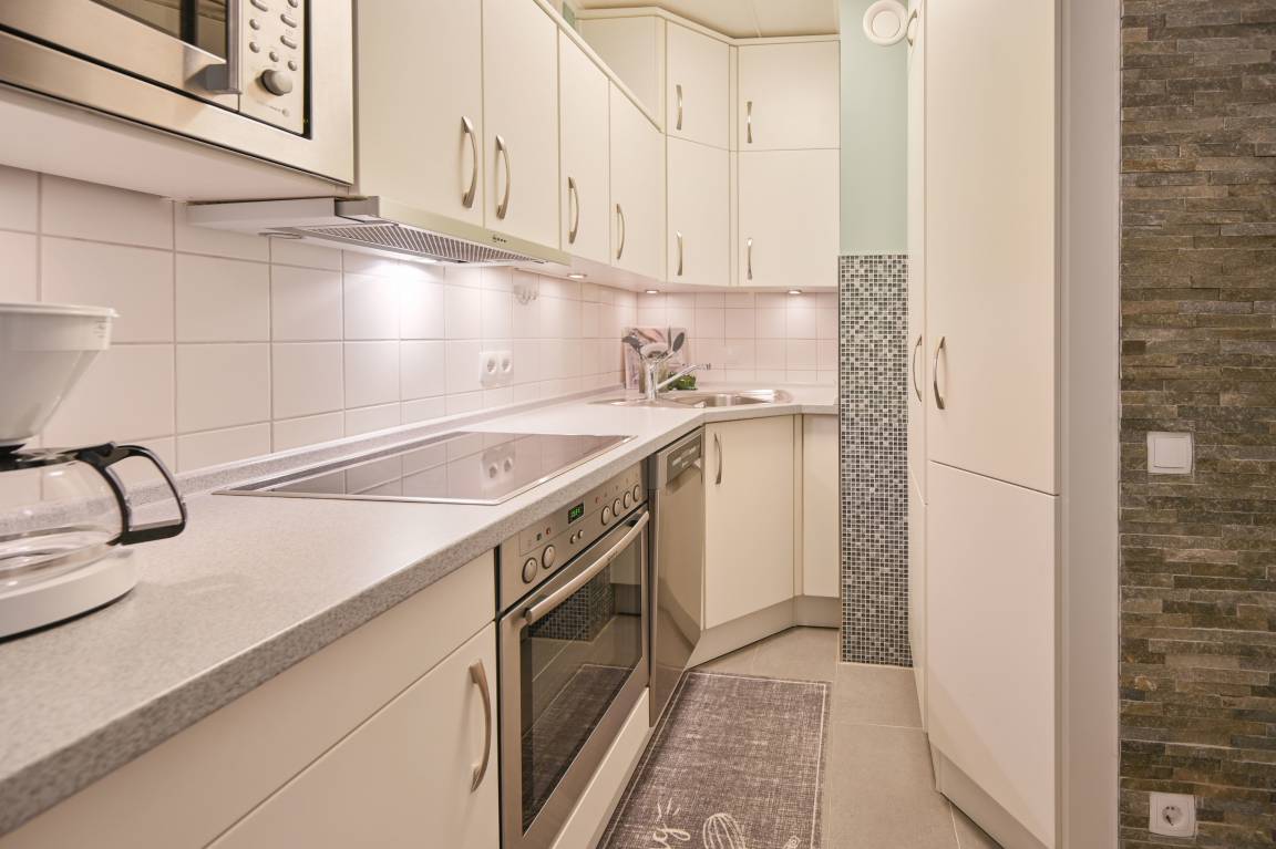In der hochwertigen Einbauküche mit Cerankochfeld, Backofen, Spülmaschine und Mikrowelle fehlt es an nichts. Vom Kühlschrank mit Gefrierefach über die Kaffeemaschine bis zum Eier - und Wasserkocher ist alles vorhanden.