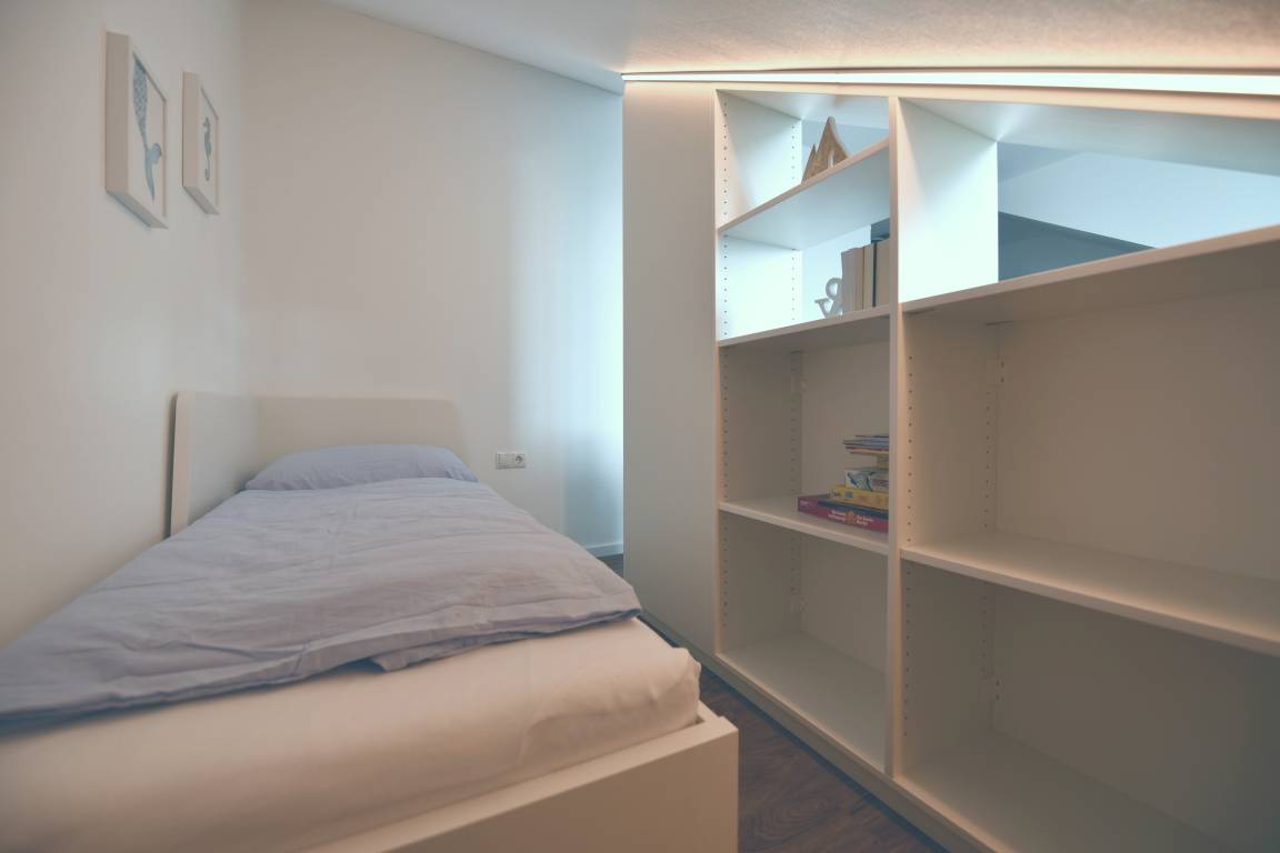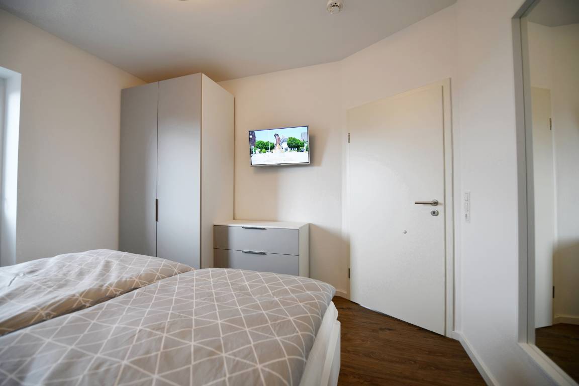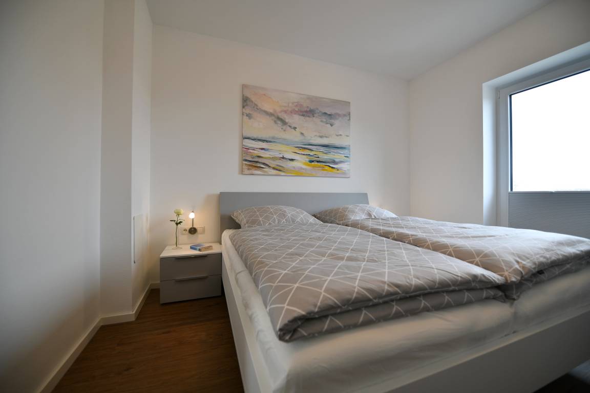 Das Schlafzimmer verfügt über ein Doppelbett (180 x 200 cm) mit 2 getrennten Matratzen und verstellbaren Lattenrosten (Härtegrad 2 und 3). Für Ihre Garderobe ist in einem geräumiger Schrank und einer Kommode ausreichend Platz. Verdunkelungsplissees und ein Fliegengitter sorgen auch für erholsamen Schlaf. Hinter einem Raumteiler im Wohnzimmer befindet sich ein weiteres Bett (80 x 200 cm).
