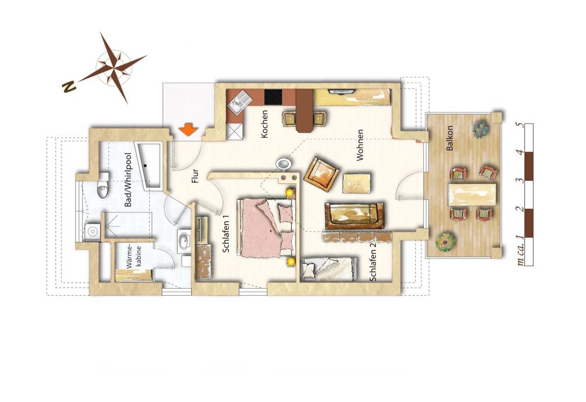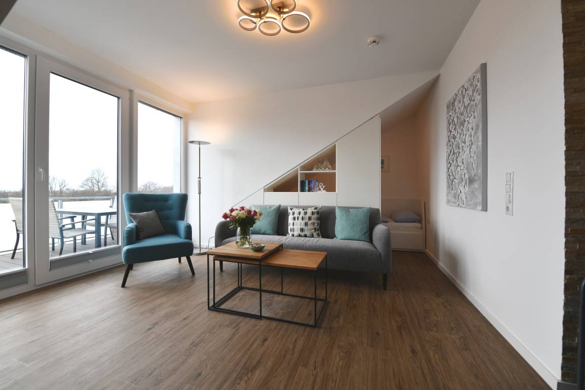 Unsere ca. 58 m² große Wohnung liegt im Dachgeschoss; erreichbar ist sie bequem und barrierefrei über einen Fahrstuhl. Die hochwertige Ausstattung der Neubauwohnung und die ruhige Lage tragen zu einem entspannten Urlaub bei. Die Kurtaxe und die Kaution werden vom Vermieter separat berechnet.