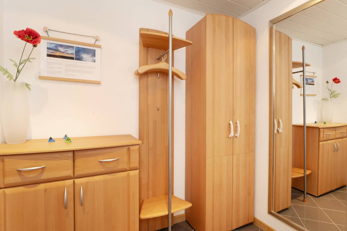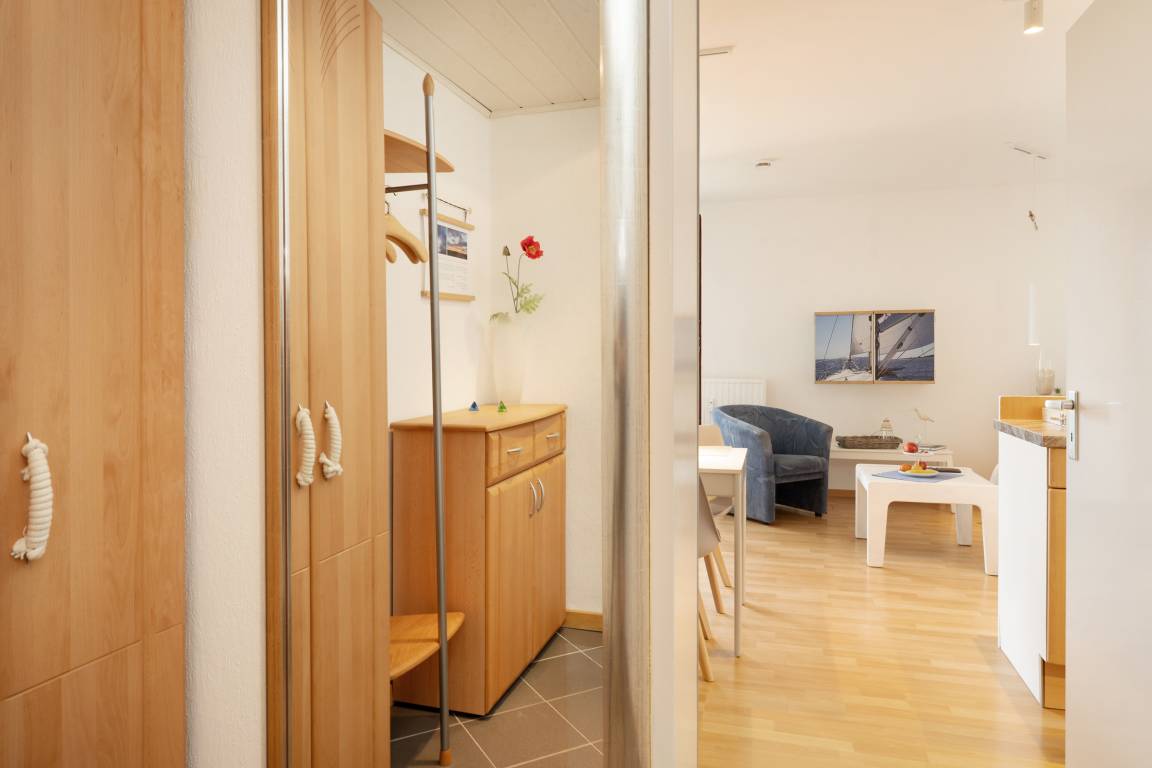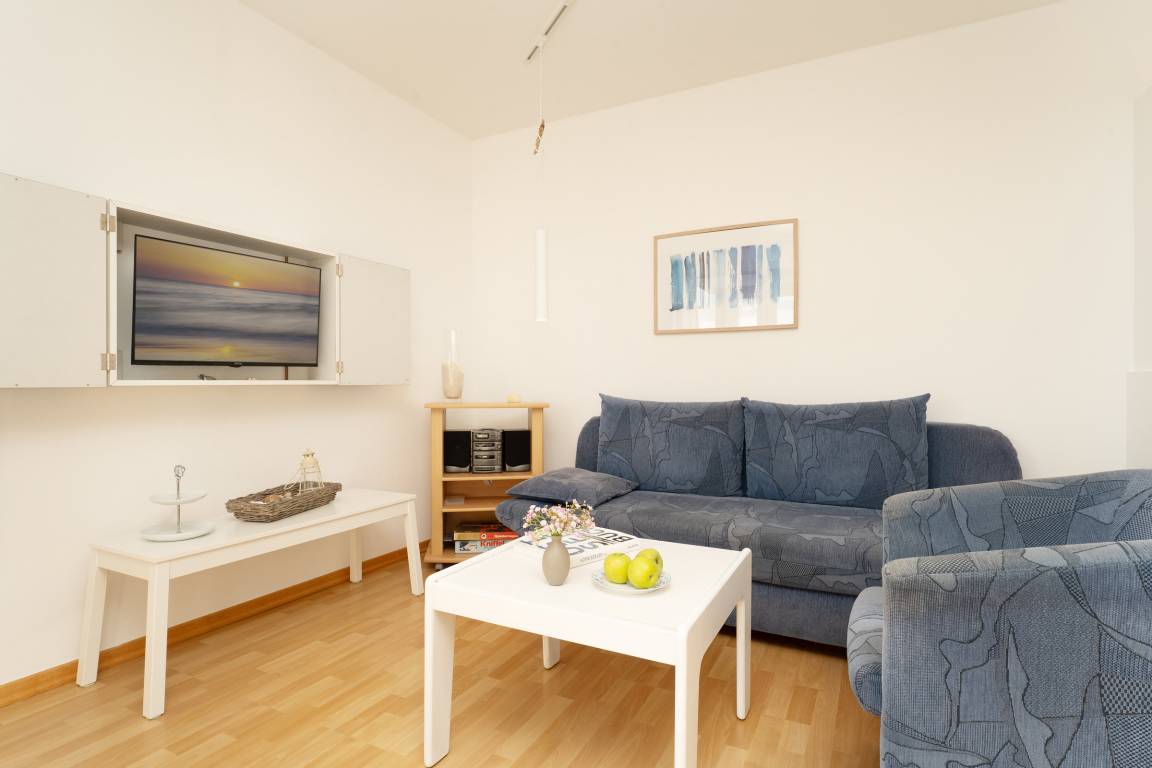 Der Name dieser schönen Wohnung ist Programm: Sie heißt Abendsonne – und genau diese können Sie auf dem großzügigen, möblierten Balkon in Nordwest-Ausrichtung gut geschützt genießen. Dazu gibt es einen herrlichen Weitblick. Auch vom Wohnzimmer aus haben Sie den tollen Blick, nehmen Sie Platz auf dem meerblauen Sofa oder dem Sessel und lassen Sie sich vom TV-Programm oder der Stereoanlage unterhalten. Die funktional ausgestattete Küche ist in den Wohnbereich integriert, ein Tresen fungiert als angenehmer Raumteiler. Den Weitblick können Sie übrigens auch vom Doppelbett (2x 90x200cm) im Schlafzimmer aus genießen, da man über den Balkon hinweg rausschauen kann. Besonders praktisch ist der Insektenschutz am Schlafzimmerfenster - so können Sie bei offenem Fenster im Bett vielleicht das Meeresrauschen hören. Der praktische Flur verfügt über Ganzkörperspiegel und Garderobe. Das innenliegende Duschbad ist hell gefliest und macht Sie munter für den nächsten Tag an der Ostsee. Der Strand ist nur rund 130 Meter entfernt.