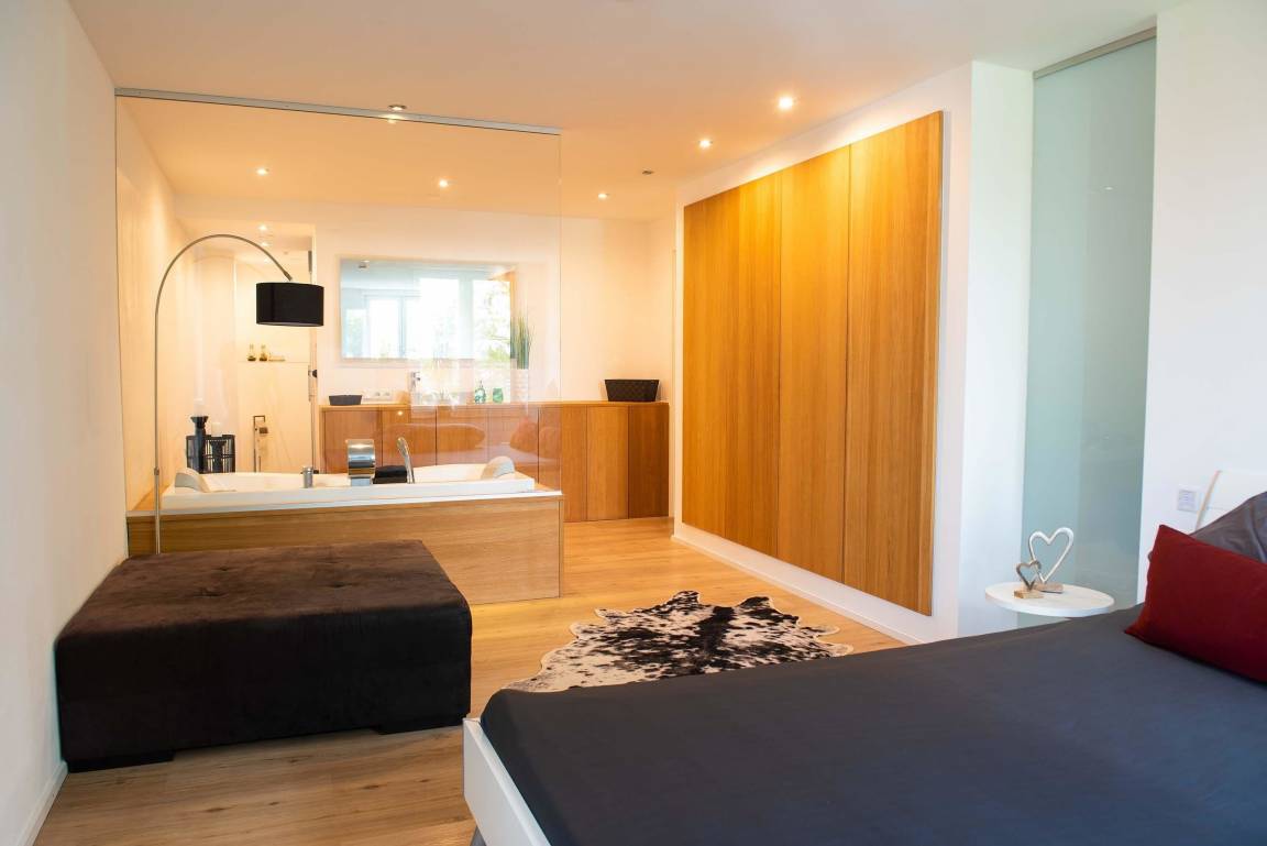 Das Schlafzimmer empfängt Sie mit einem 200x220cm Doppelbett und Zugang zum Badezimmer. Im Schlafzimmer ist eine offene Whirlpoolwanne integriert.