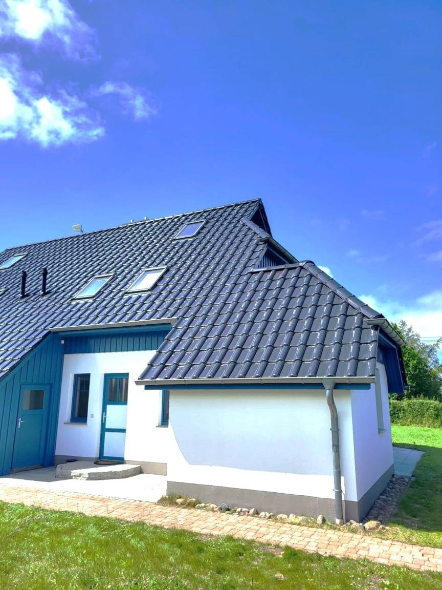 Von der über 40 m² großen Terrasse (mit Tisch, Stühlen, Rollliege) hat man einen sehr schönen Weitblick über Wiesen und Felder. Die malerische Bucht Grabow an der Ostsee ist vom Haus sichtbar. Bei klarem Wetter sieht man die Insel Hiddensee.