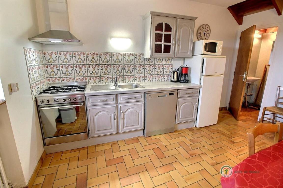 Erdgeschoss: rustikales Wohnzimmer mit Essecke und eingebauter Küche, WC. Etage: 3 Schlaf-Zi. (4 Doppelbetten), Bade-Zi. Hof, Garten und Rasen.