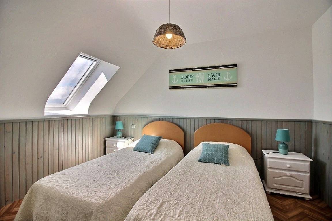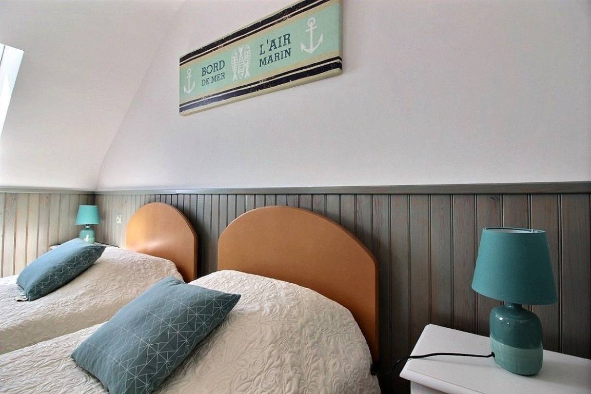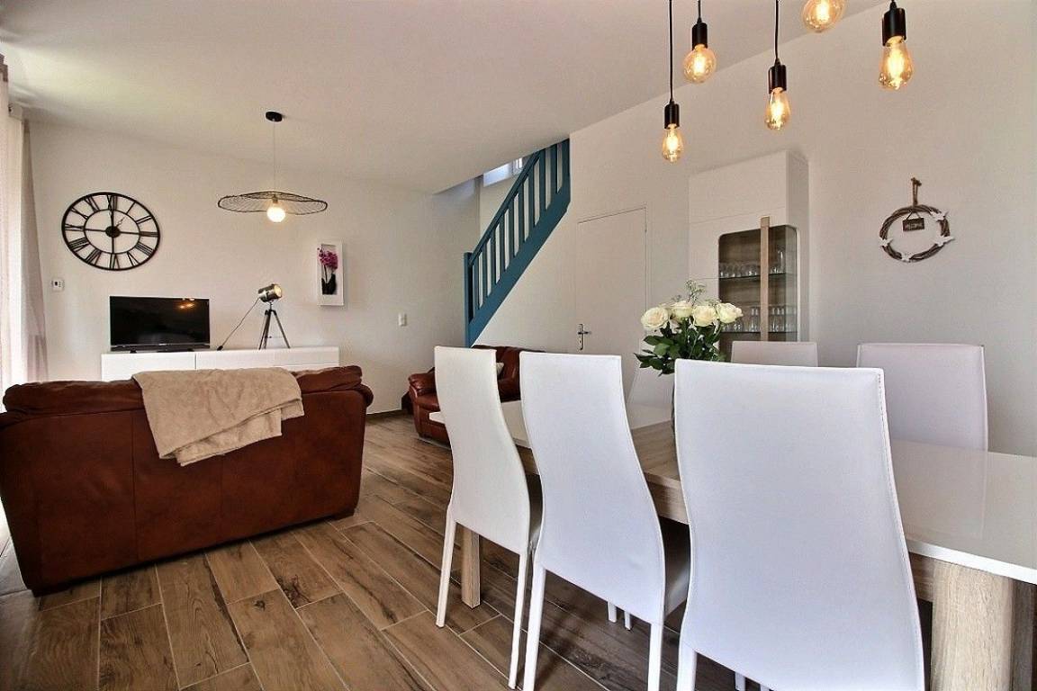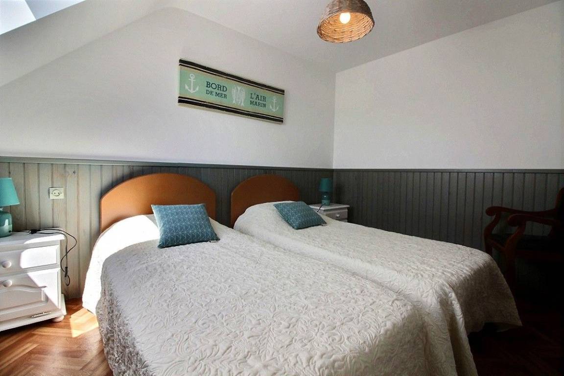 Dieses Ferienhaus bietet: Im Erdgeschoss: eine schöne, komplett ausgestattete Einbauküche mit ihrer Mittelinsel und mit Öffnung zu einem Ess-Wohnsalon, ein separates WC. Im 1. Stock: 2 Zimmer (2 Einzelbetten 90x190) (1 Bett für 2 Personen 160x200), ein Badezimmer. Im 2. Stock: 1 Zimmer (2 Einzelbetten 90x190), ein Bad mit WC. Zur Verfügung stehen auch: Kleiner Garten mit Rasenfläche und Terrasse. Parkmöglichkeit direkt vor dem Haus.