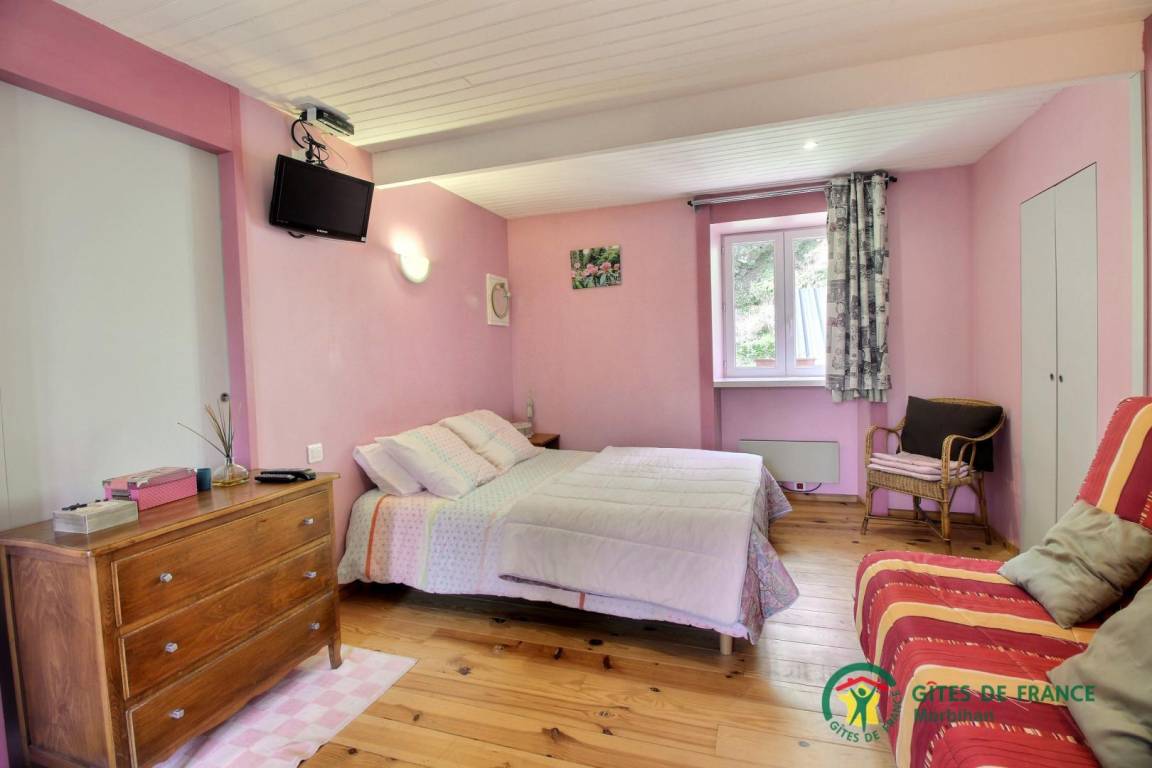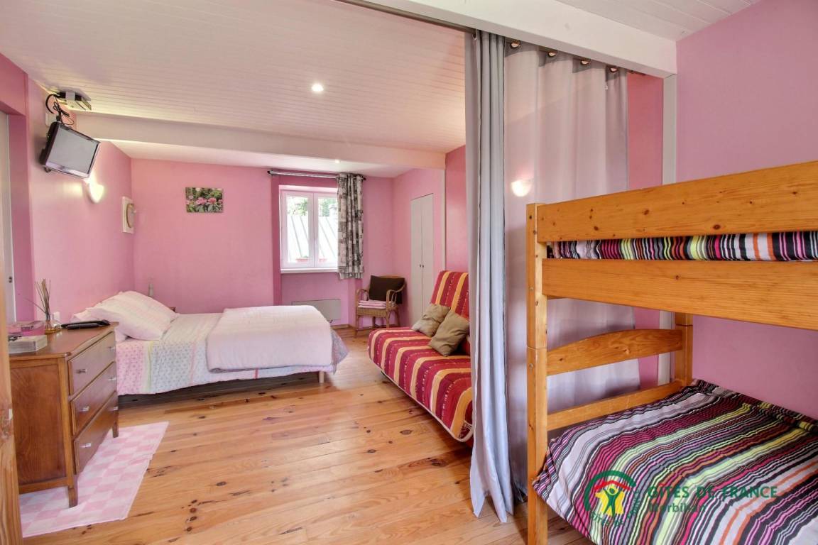 - Obergeschoss: ein großes Schlafzimmer im Zwischengeschoss (1 Bett 140 x 190, 2 Betten 90 x 190, davon 1 Etagenbett).