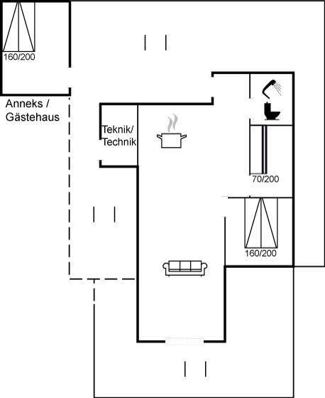 SchlafverhältnisseDie Schlafplätze verteilen sich auf 3 Schlafräume. 4 Schlafplätze in Doppelbetten. 2 Schlafplätze in einem Etagenbett. 2 von diesen Schlafplätzen befinden sich im Gästehaus. Ferner steht ein Kinderbett zur Verfügung.