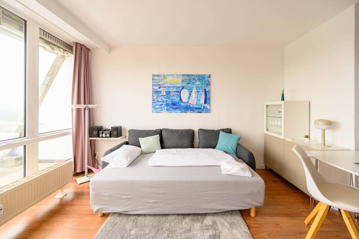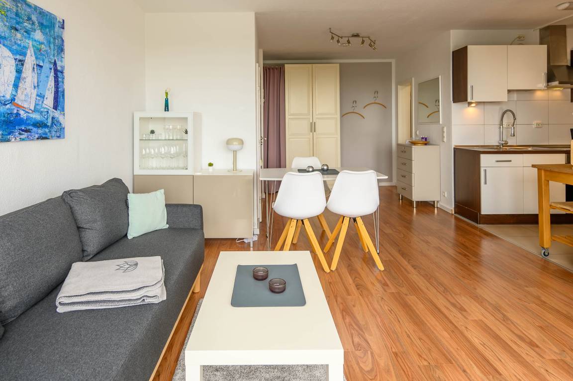 In der 3. Etage (kein Fahrstuhl) in dem terrassenförmig angelegtem Olympiazentrum liegt diese Ferienwohnung mit 1,5 Zimmern. Auf 46qm bietet sie Platz für bis zu drei Personen. Der lichtdurchflutete Wohn-, und Essbereich ist hell und modern eingerichtet. Neben einem Tisch mit Stühlen befindet sich in dem mit Laminat ausgelegtem Bereich auch eine gemütliche Couch. Das Sofa lässt sich mit wenigen Handgriffen in eine bequeme Schlafcouch (Liegefläche von 160x200 cm) umwandeln und bietet Platz für bis zu 3. Personen. Bei Bedarf lässt sich das Appartment natürlich mit Gardinen abdunkeln. Neben einem 40 Zoll Flachbild-Fernseher und einer Stereoanlage, steht Ihnen kostenlos WLAN zur Verfügung. Ein Kleiderschrank sorgt für genügend Verstaumöglichkeiten.