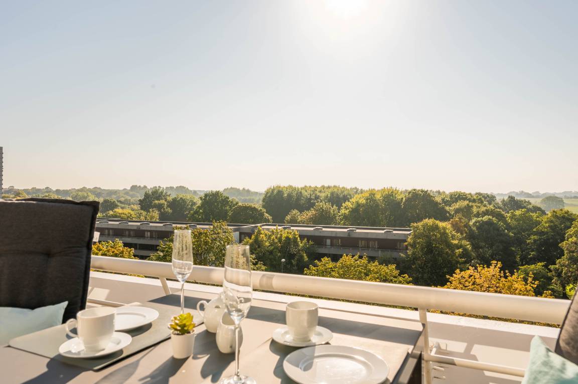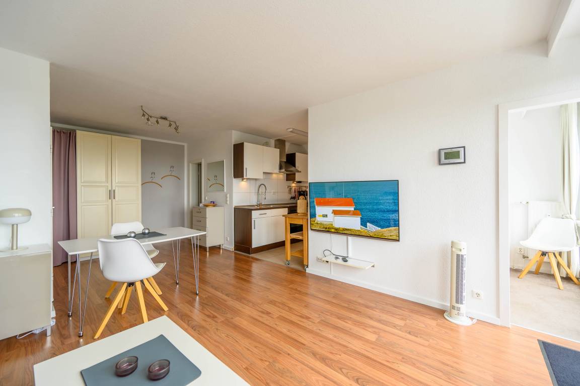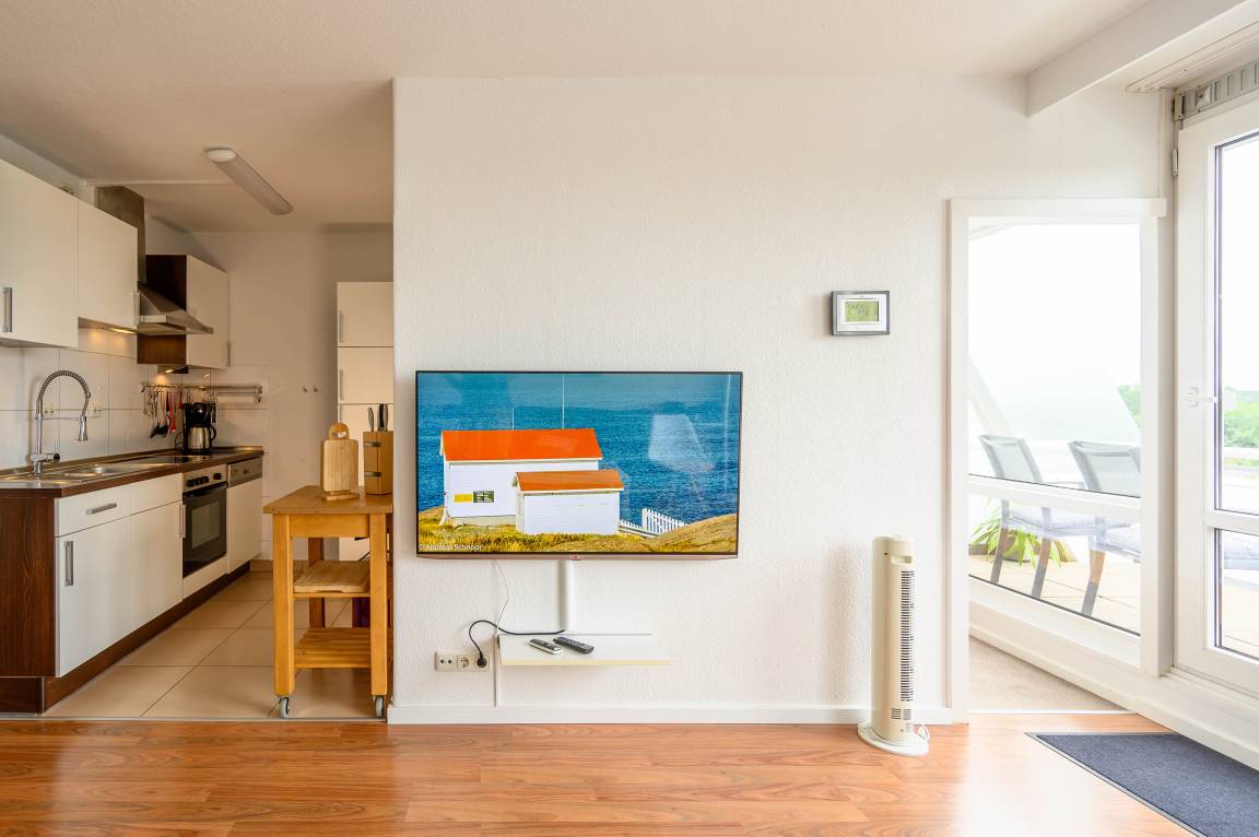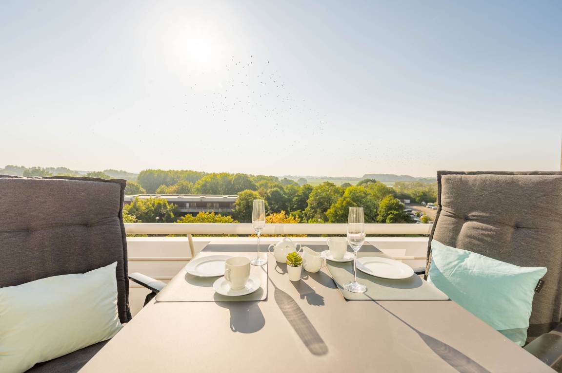 Die bodentiefe Fensterfront des kombinierten Wohn-, und Essbereiches lässt einen auf den 9qm großen Balkon blicken. Er ist mit Hochlehner-Stühlen, einem Tisch und einer Markise ausgestattet. Die freie Aussicht zu den Salzwiesen ist ruhig und Sie können den ganzen Tag die Sonne in vollen Zügen genießen (Süd-West-Lage).
