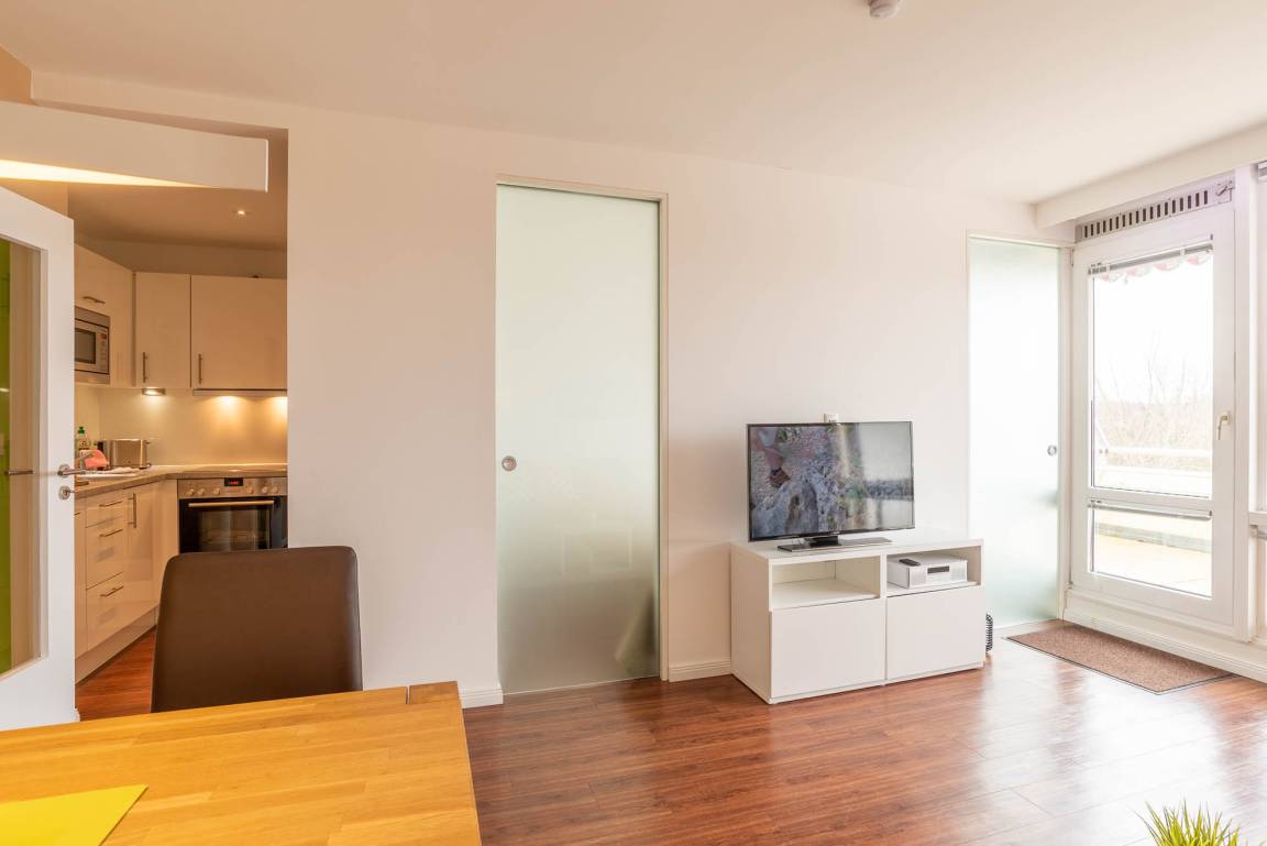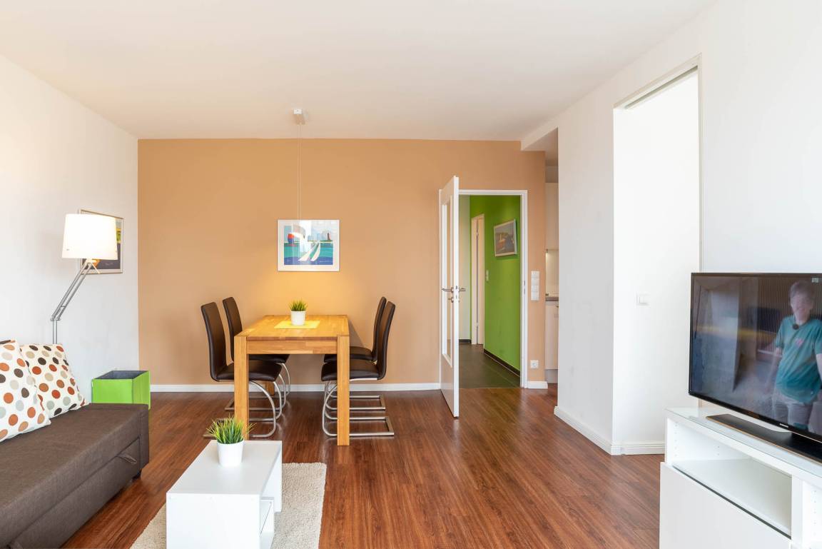 Der helle Wohn-Essbereich ist mit einer gemütlichen Couch eingerichtet. Der an der Wand angebrachte Flat-TV ermöglicht entspannte Film- und Fernsehabende in der Wohnung zu verbringen. Kostenloses WLAN und ein Bluetooth-Radio finden Sie ebenfalls in diesem Apartment vor. Das durch zwei Milchglas Schiebetüren vom Wohnbereich abgetrennte Schlafzimmer lässt sich selbstverständlich, wie auch der Rest des Apartments, durch angebrachte Gardinen und Jalousien abdunkeln. Auch im Schlafzimmer ist vor dem Doppelbett (160x200) ein Flachbildschirm für Sie angebracht. Ein Einbauschrank mit genügend Stauflächen ist ebenfalls vorhanden.