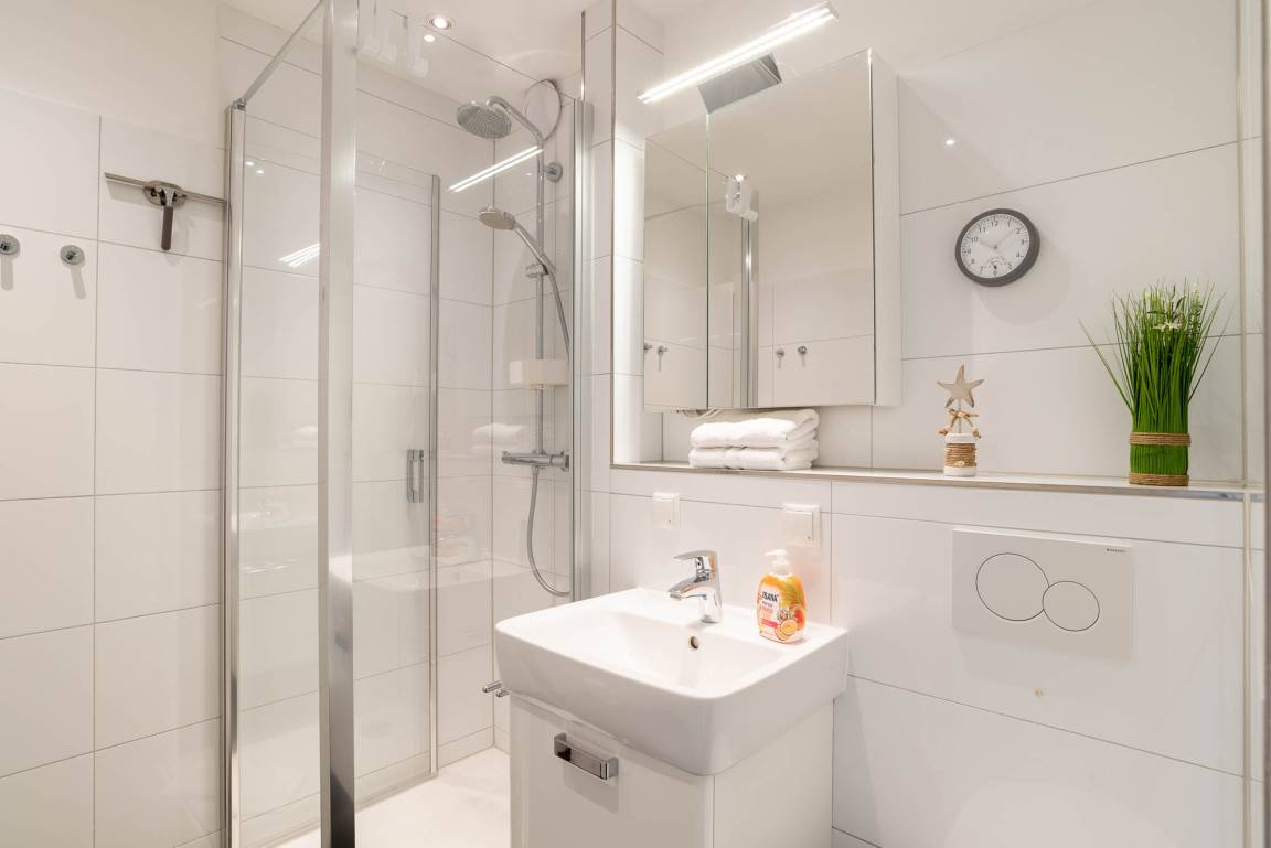 Bei der Ankunft im Apartment bietet der große Flur genügend Platz, um sich wohlzufühlen. Wiederkehrende grüne Farbakzente finden sich im Flur und gesamten Wohnbereich wieder. Vom Flur aus gelangen Sie in das moderne Badezimmer. Es bietet über genügend Ablagemöglichkeiten, sowie eine Handtuchheizung. Als weiteres Highlight befindet sich in der Dusche eine Regenwalddusche.
