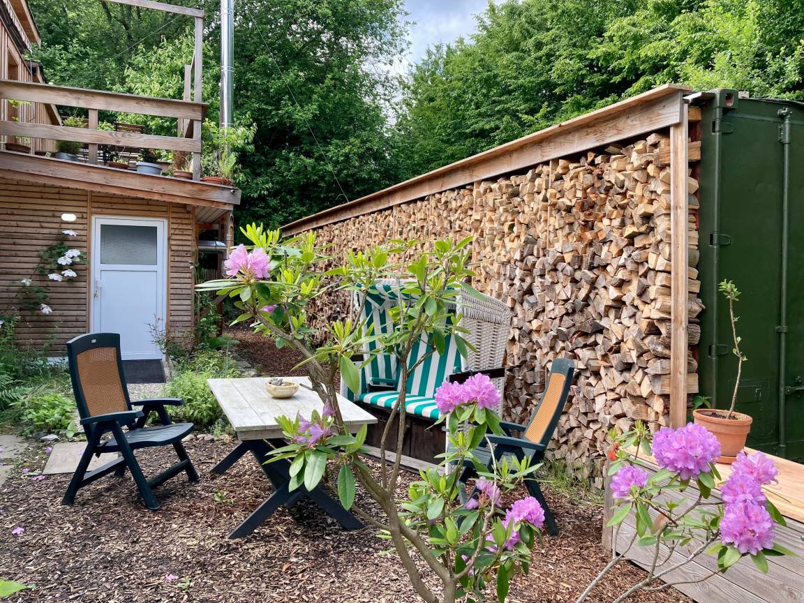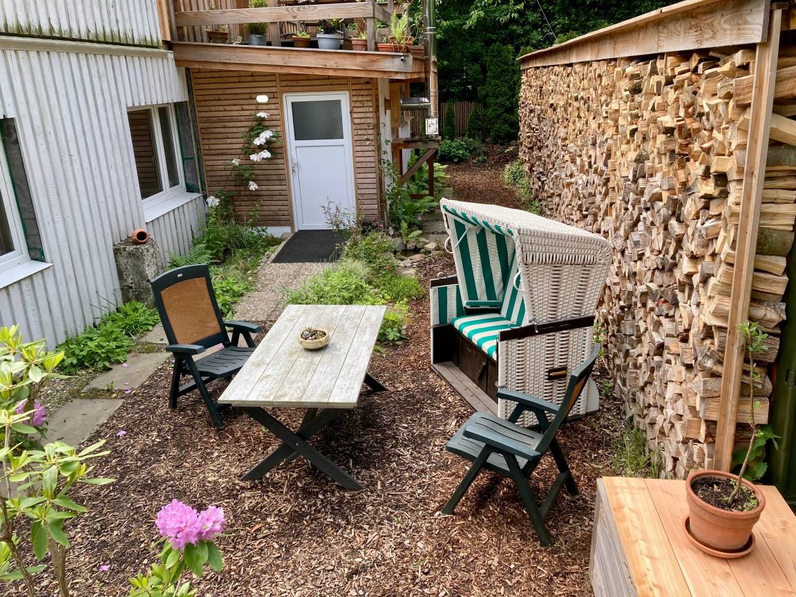 Vor der Wohnung ist auf einer ca. 25m² großen Terrasse Platz zum gemütlichen Sitzen, Grillen etc.