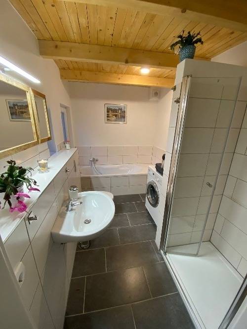 Ein 2. Zimmer kann auch als Schlaf-/Arbeitszimmer genutzt werden. Badezimmer ca. 7 m² mit Duschbad und Badewanne. Eine kleine Küche mit Ceran, Ofen, Grill