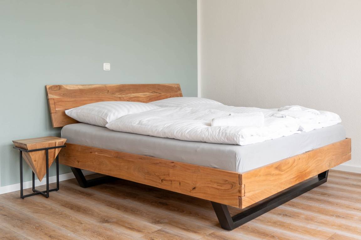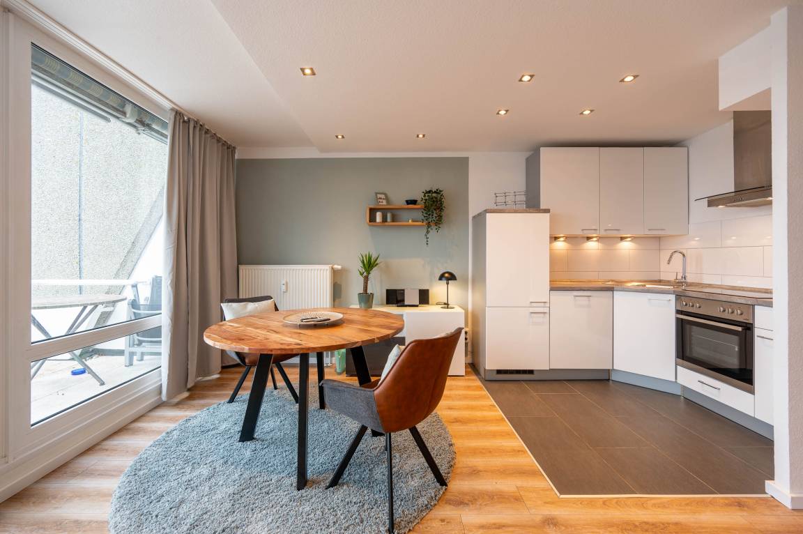 Die moderne Küche ist komplett eingerichtet, und hat alles, was man zum Kochen braucht: Es befindet sich in der Küche eine Geschirrspülmaschine, ein Backofen, ein Kühlschrank mit Gefrierfach und ein Herd. Gläser, Porzellan, Töpfe und Besteck sind für 4 Personen vorhanden. Die Ferienwohnung hat ein gemütliches Doppelbett (Liegefläche 160x200). Die Betten sind bei Ihrer Ankunft bezogen. Im Flur befindet sich ein Kleiderschrank mit Garderobe und eine kleine Abstellkammer.