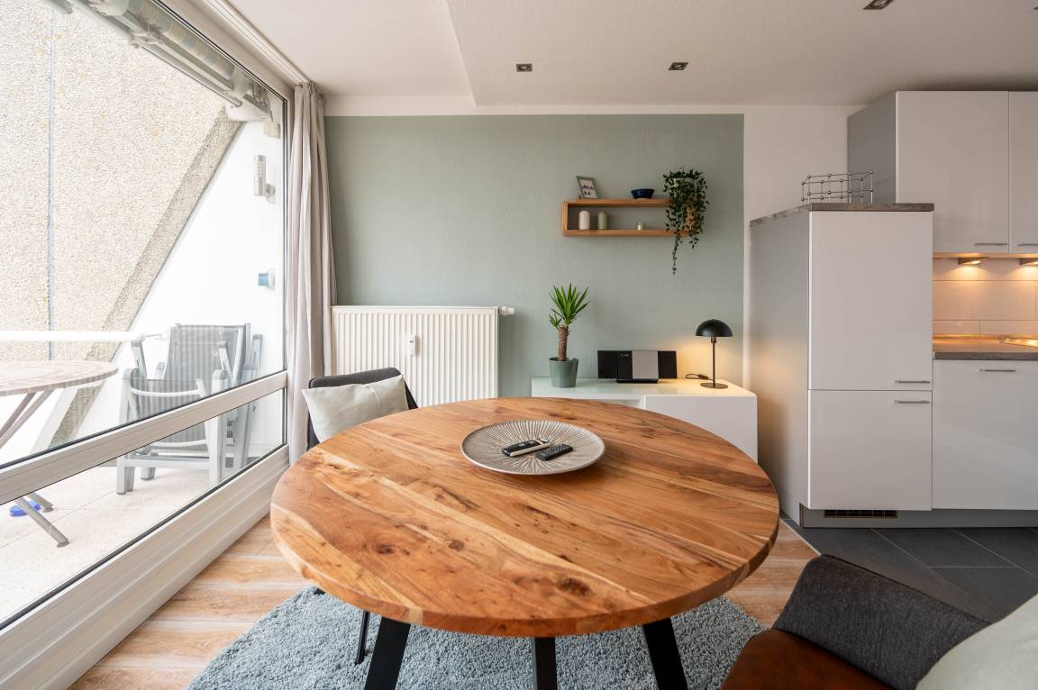 Zu dieser Wohnung gehört ein 9 qm großer Balkon mit Hochlehner-Stühlen, ein Tisch und eine Markise. Der freie Blick zu den Salzwiesen ist ruhig und Sie können den ganzen Tag die Sonne genießen (Süd-West-Lage).