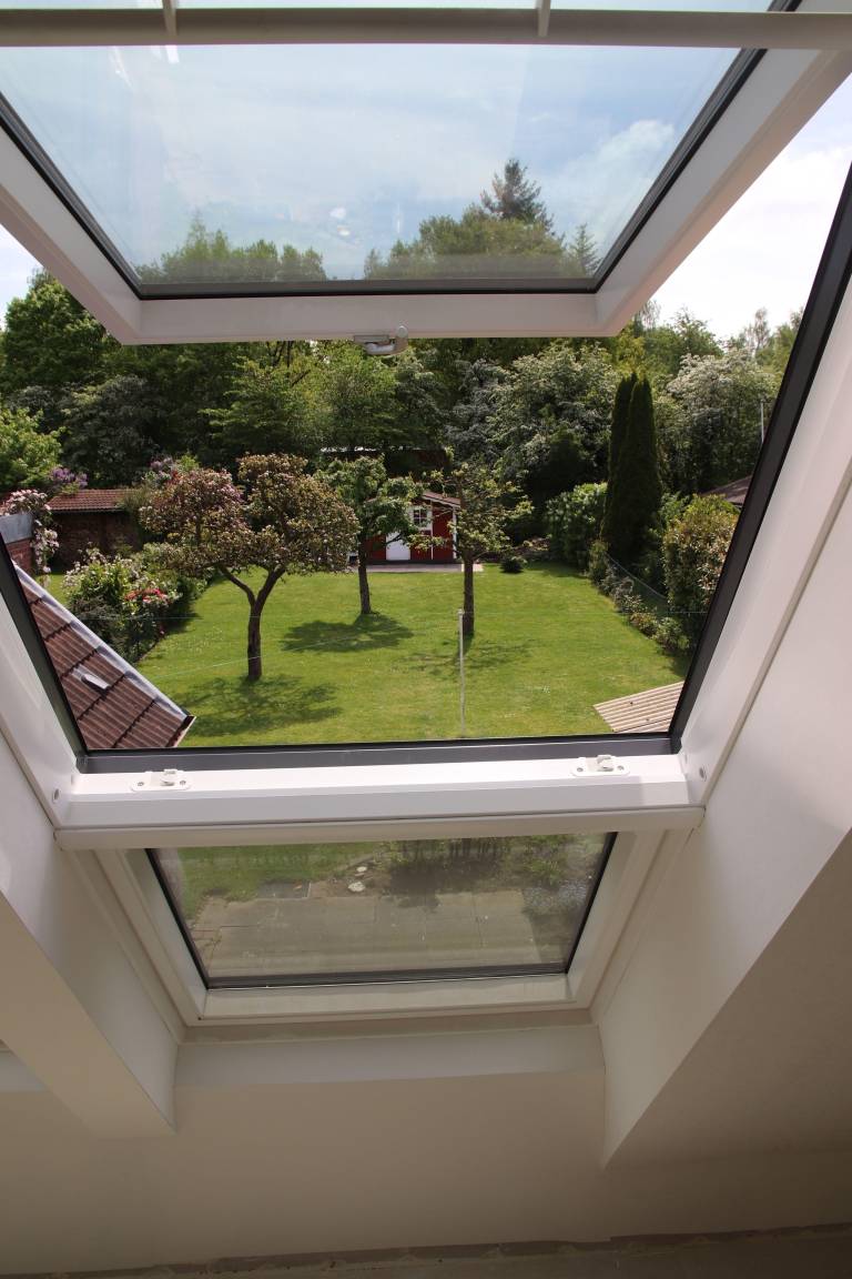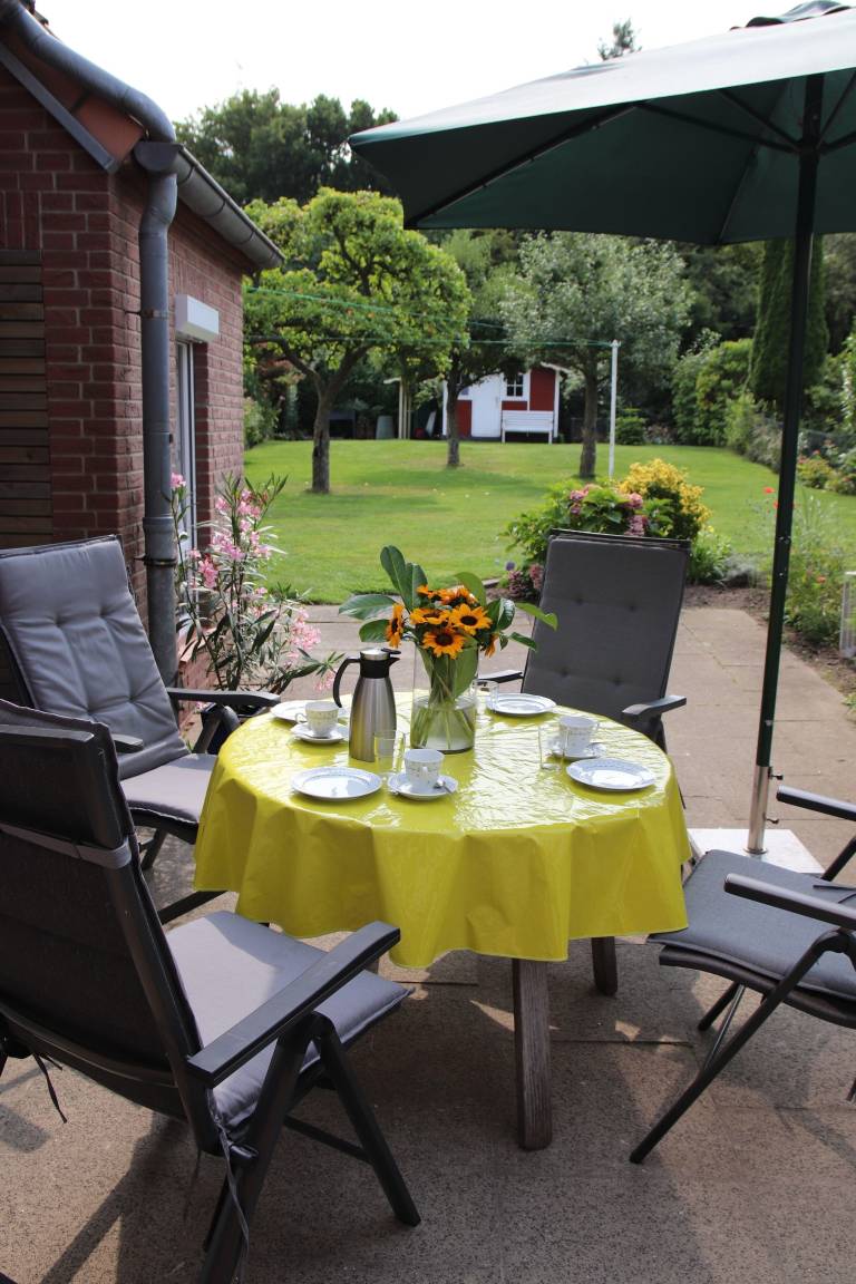 Von der 25 qm großen Terasse haben Sie einen entspannten Blick auf die in einem rund 400 qm großen Garten stehenden Obstbäume. Zum Ferienhaus gehört ein überdachter PKW- Stellplatz. Mitgebrachte oder gemietete Fahrräder können in einem Unterstand wettergeschützt abgestellt werden.