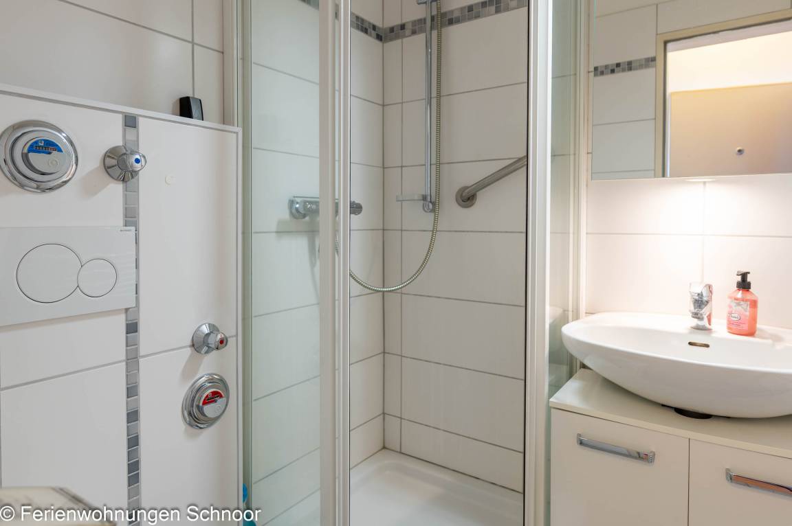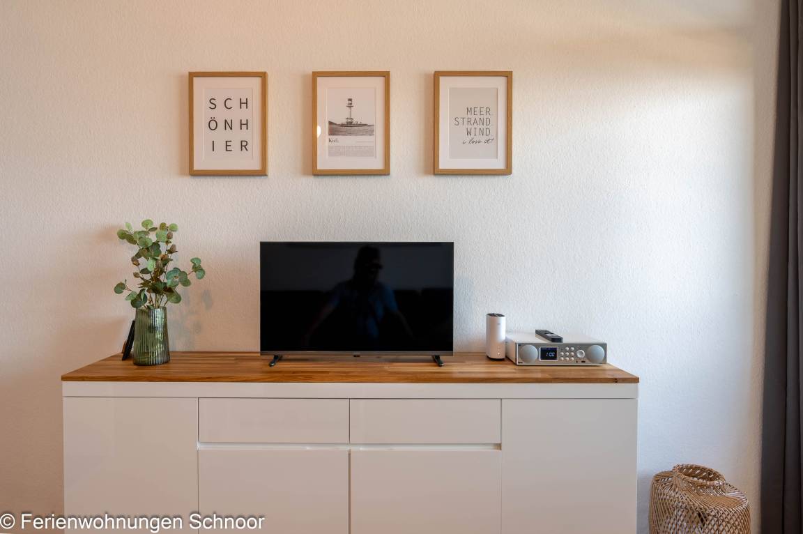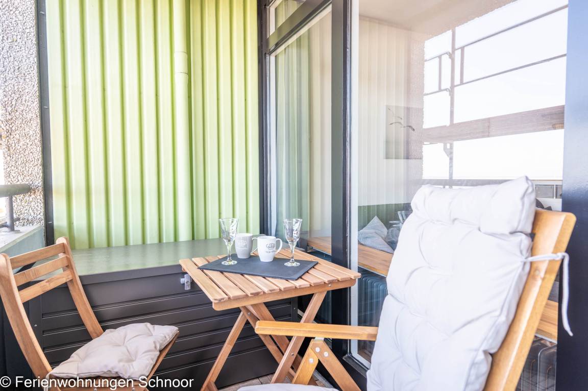 Der Wohnbereich verfügt über ein Schlafsofa (160 x 200 cm). Darüber hinaus besitzt die Wohnung einen Balkon (6 m²), direkt begehbar über den Wohnbereich. Unser Tipp: Frühstücken Sie hier morgens bei Sonnenschein und planen Sie Ihren Tag mit dem wunderbaren Blick auf die Schilkseer Bucht.