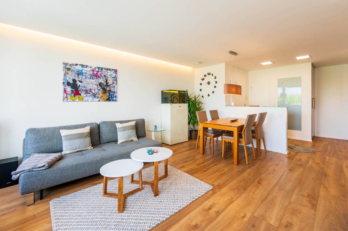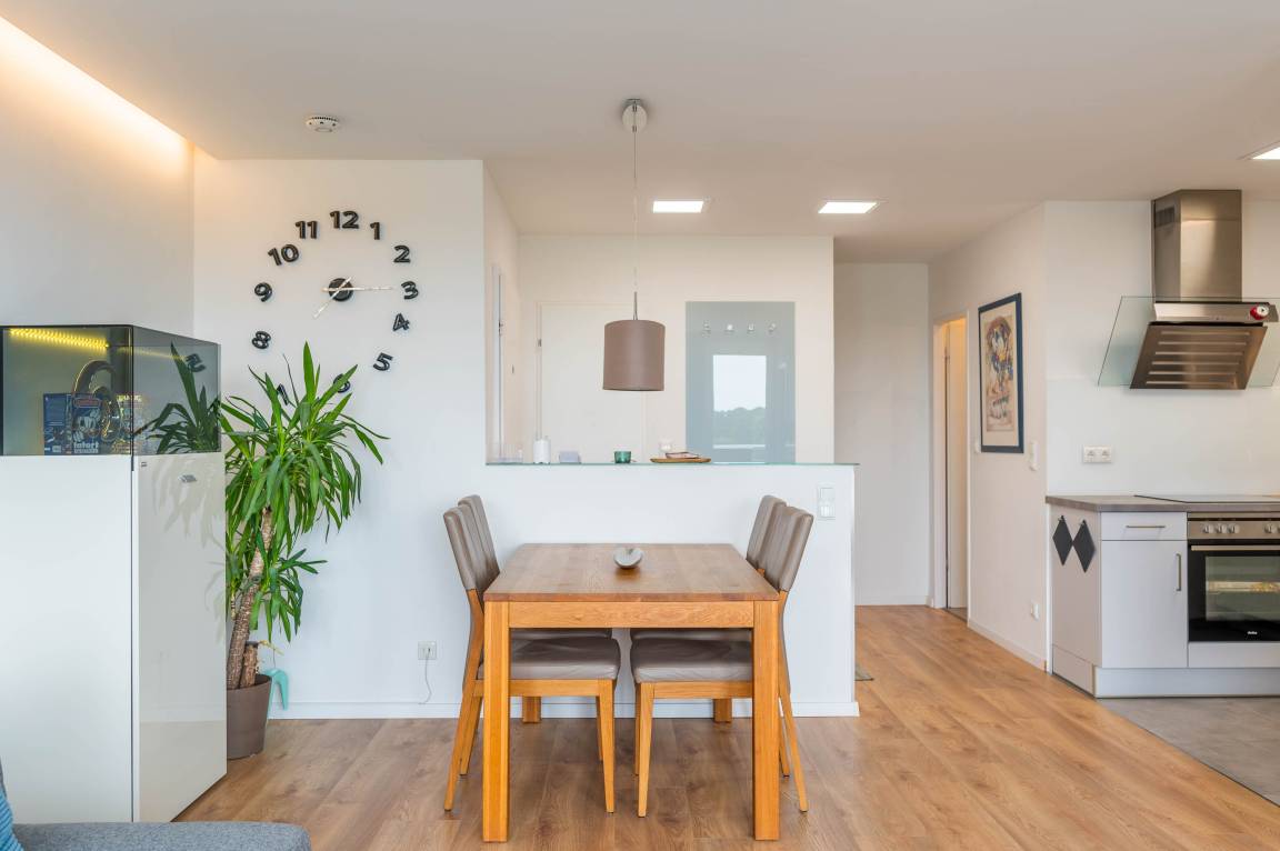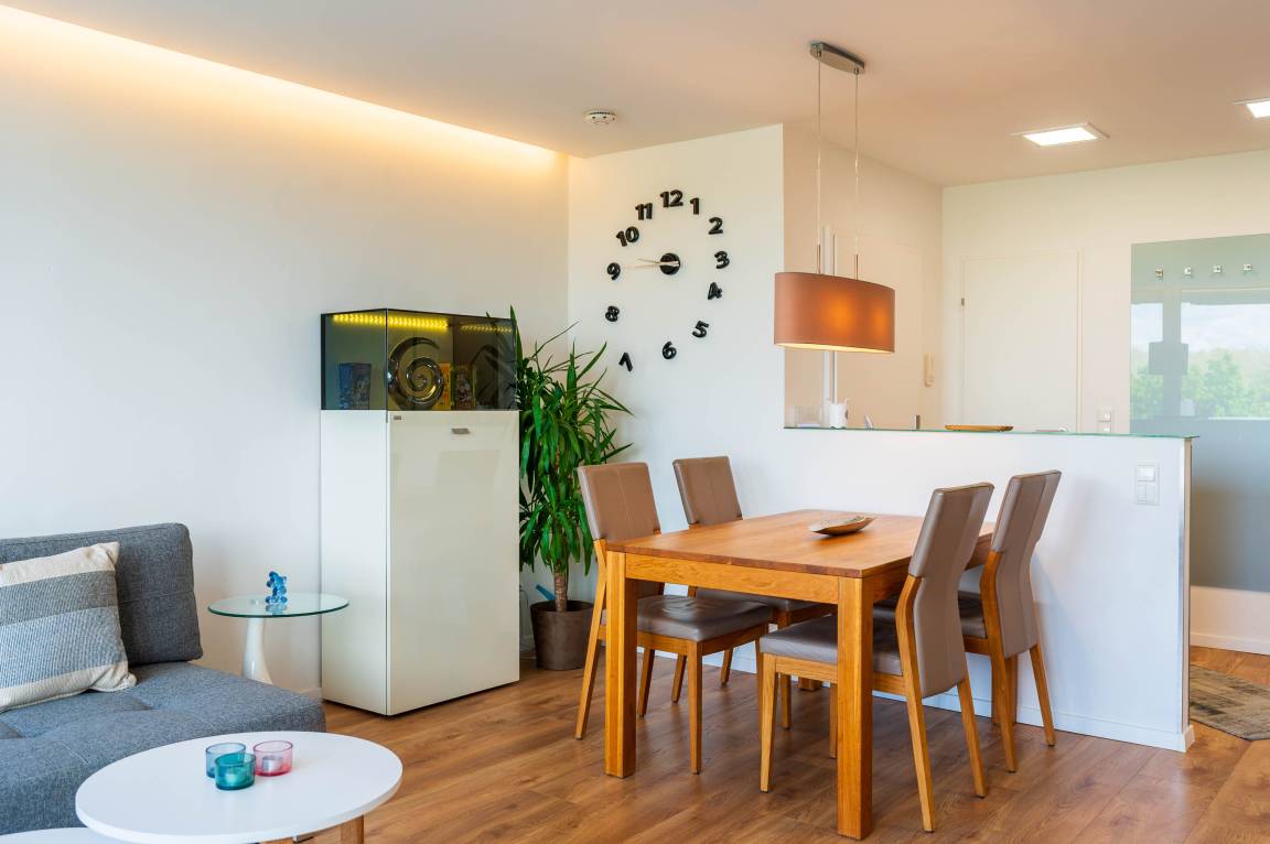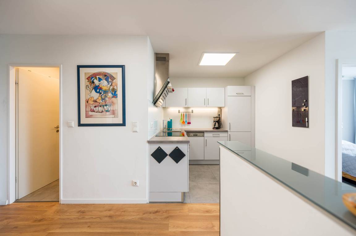 Diese komplett renovierte und modern eingerichtete Ferienwohnung ist durch die bodentiefe Fensterfront in südwestlicher Richtung komplett lichtdurchflutet und lädt mit dem hellen Laminat-Fußboden zum Wohlfühlen ein. Durch eine eingezogene halbhohe Wand wird der Eingangsbereich optisch geschickt vom Wohn- und Essbereich getrennt. Somit bekommt das Apartment einen loftartigen-Charakter. Im Flurbereich befinden sich eine Abstellkammer und ein Kleiderschrank.