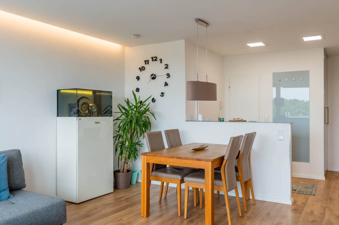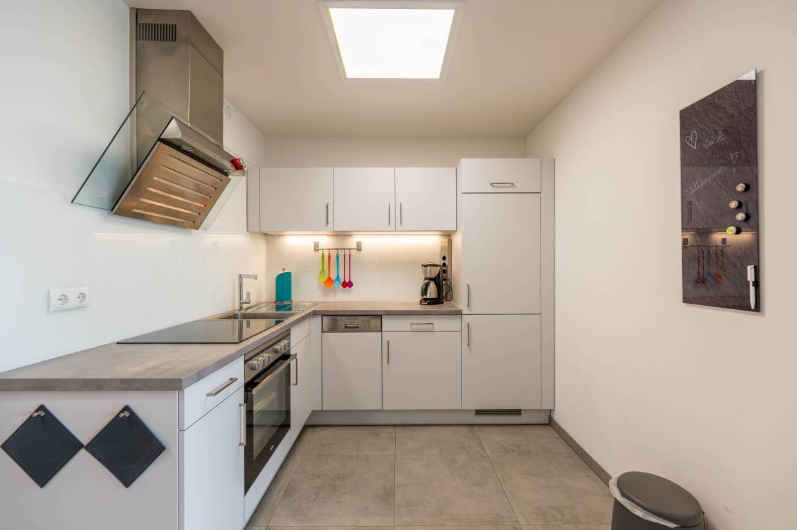 Im Wohnbereich bietet ein großer Holztisch mit vier bequemen Stühlen ausreichend Platz – perfekt für ein Essen in gemeinsamer Runde. Direkt gegenüber befindet sich die angrenzende Einbauküche. Die offene Küche mit Arbeitsfläche in Betonoptik ist mit hochwertigen Elektrogeräten ausgestattet. Ceranherd, Backofen und Geschirrspüler, Kühlschrank mit separatem Gefrierfach, Wasserkocher, Toaster und eine Kaffeemaschine bietet eine Ausstattung fast wie zu Hause.