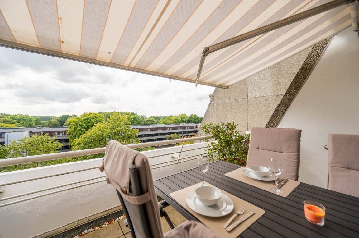 Der Balkon, welcher sich über die gesamte Breite des Apartments verläuft, ist mit Tisch und Stühlen sowie einer Markise ausgestattet. Durch die südwestliche Lage können Sie auch abends die Sonne in vollen Zügen genießen.