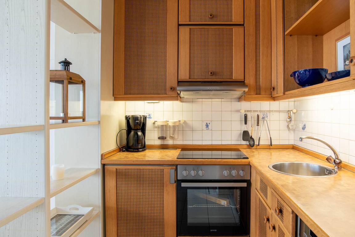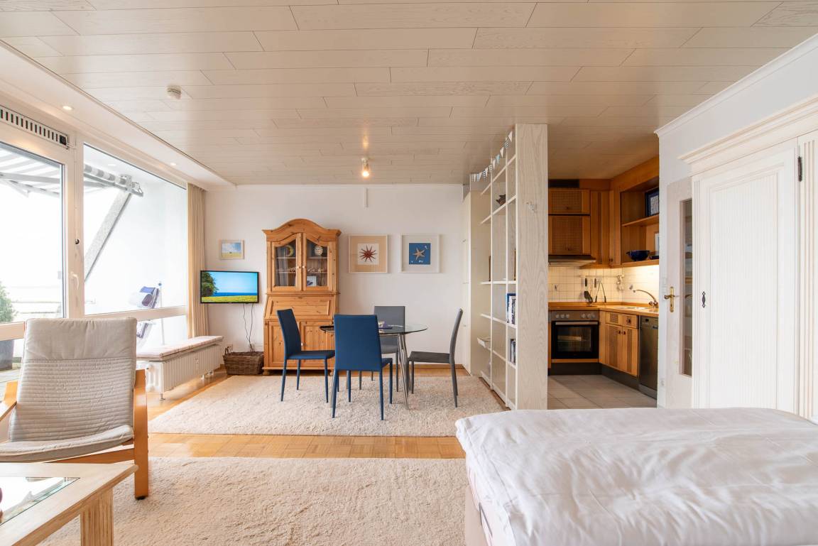 Im kombinierten Wohn-, und Essbereich befindet sich direkt am Fenster ein geschmackvolles Sofa, ein Couchtisch und ein Sessel. Auch vom Esstisch aus, welcher sich auf der anderen Seite der Fensterfront befindet, haben Sie einen tollen Blick nach draußen. Die offene Pantry-Küche ist optisch durch ein Regal vom Essbereich abgetrennt. In der Einbauküche finden Sie alles, was Sie für ein exklusives Frühstück auf dem Balkon in der Morgensonne brauchen. Neben Kaffeemaschine, Toaster und Wasserkocher befindet sich auch noch ein Kühlschrank mit separatem Gefrierfach, ein Ceranherd mit Backofen und sogar ein Geschirrspüler.