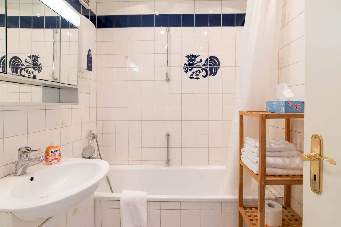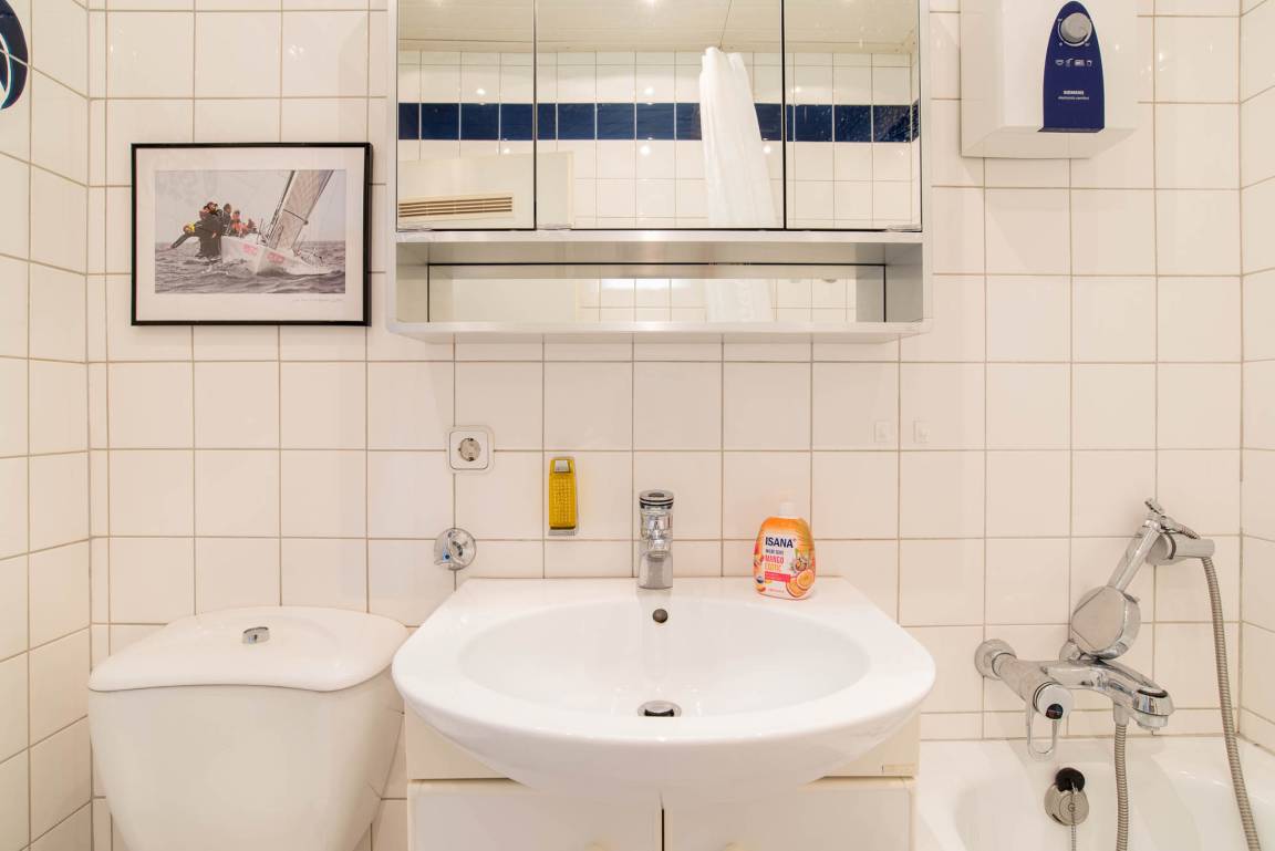 Das Badezimmer mit Badewanne befindet sich in einem gepflegten Zustand und verfügt neben einem Spiegel noch über ausreichend Ablagefläche.