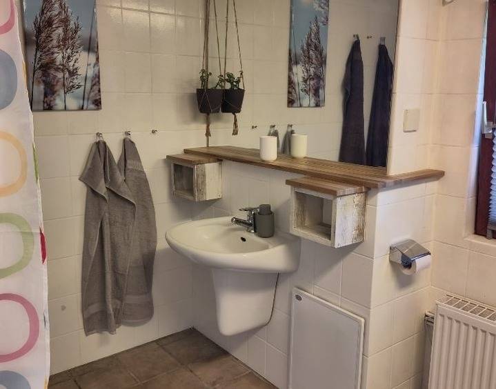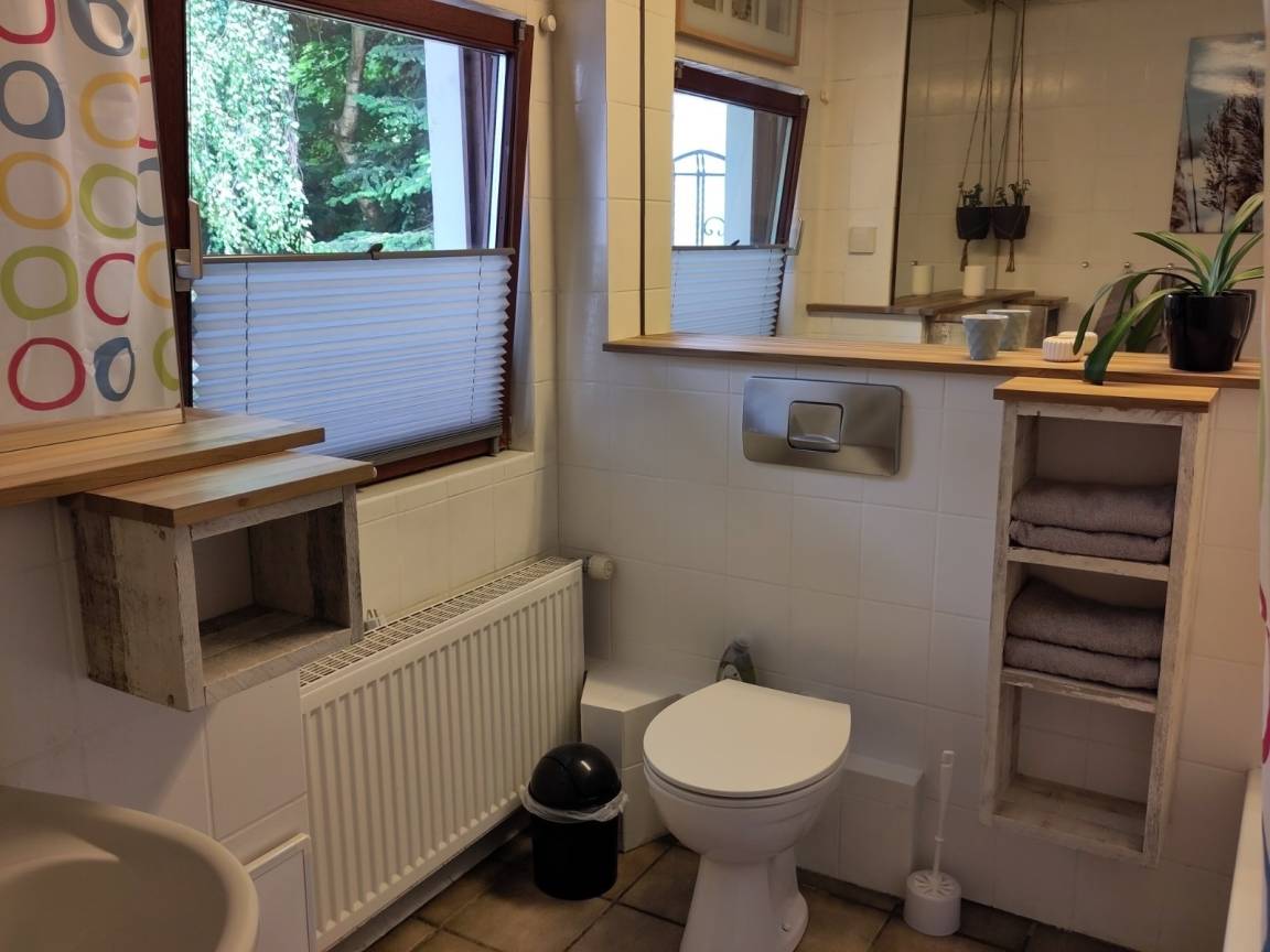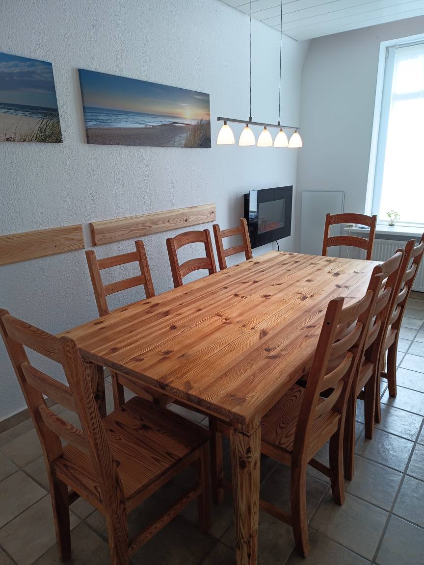 Ein Wohn-/Esszimmer 13m² mit großem Esstisch, ein Badezimmer 8 m² mit Dusch-/Wannenkombination.