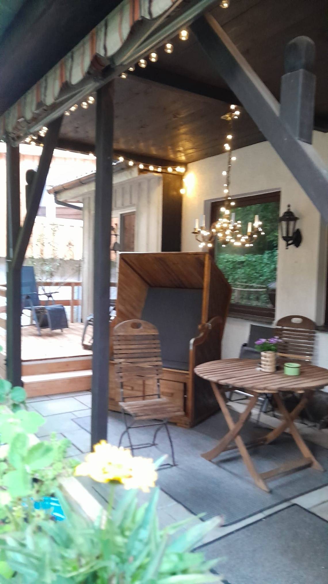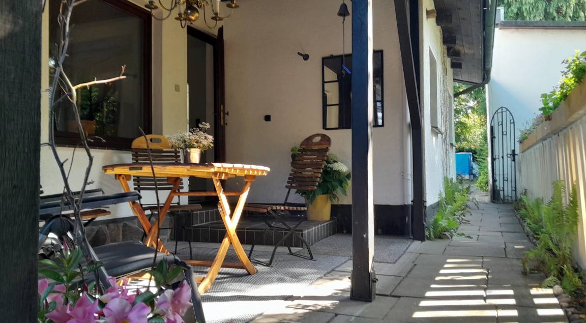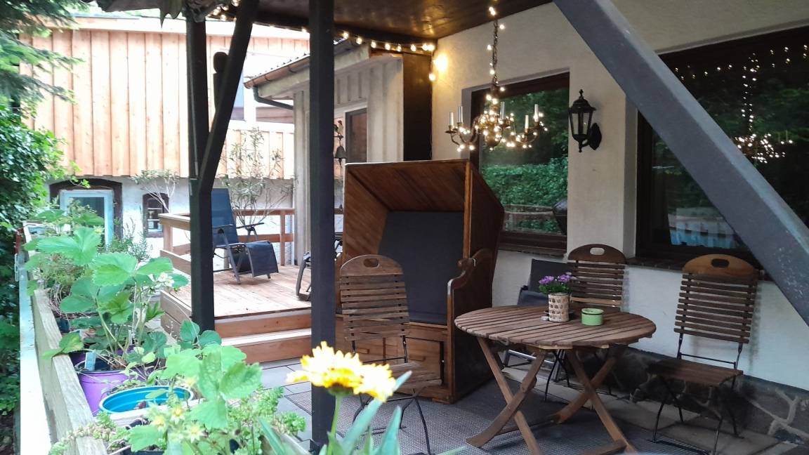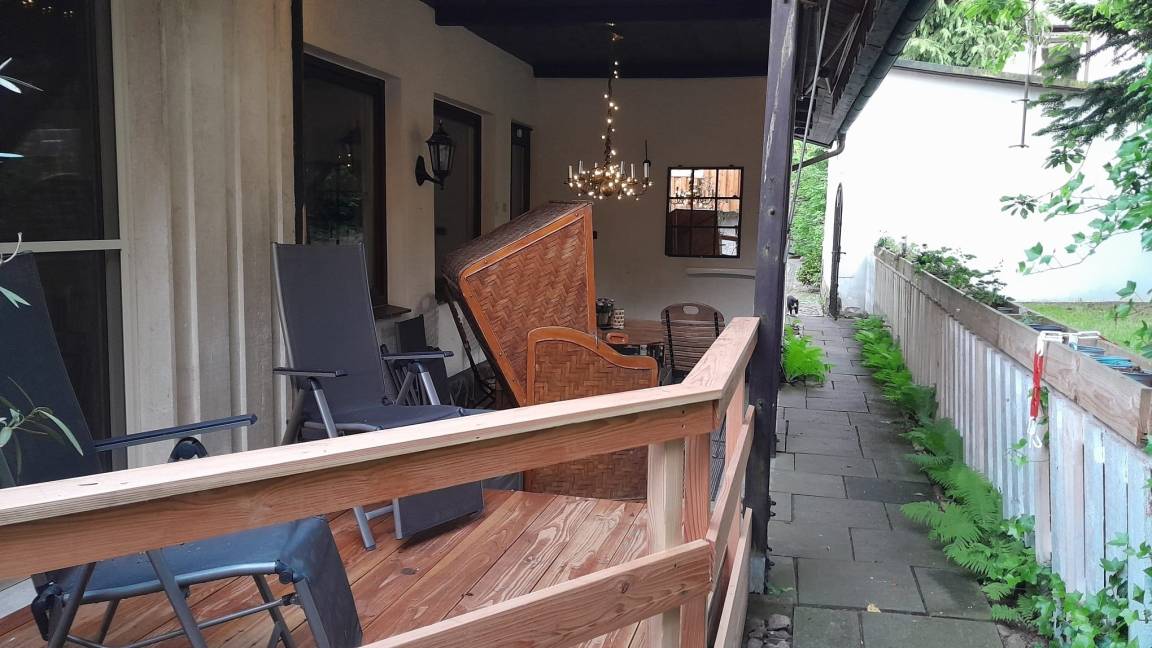 Vor dem Wohnzimmer, angrenzend an einen großen Vorgarten, ist auf einer ca. 25m² großen Terrasse Platz zum gemütlichen Sitzen, Grillen etc.