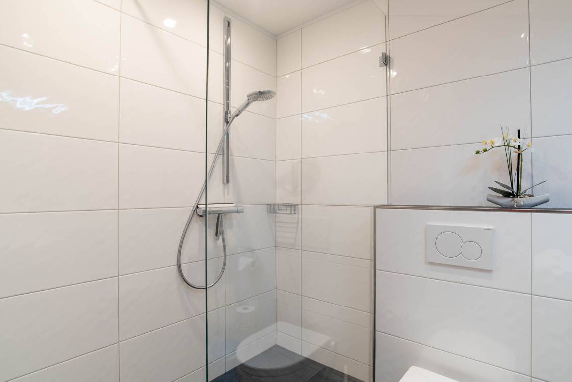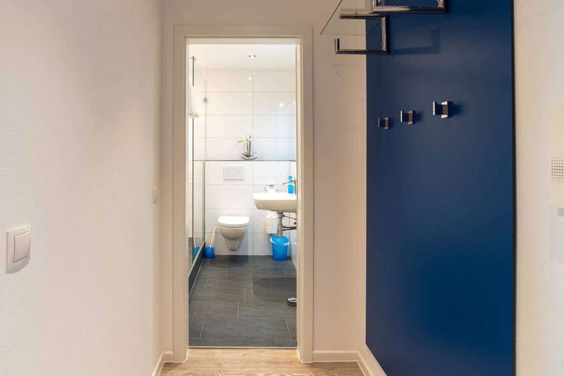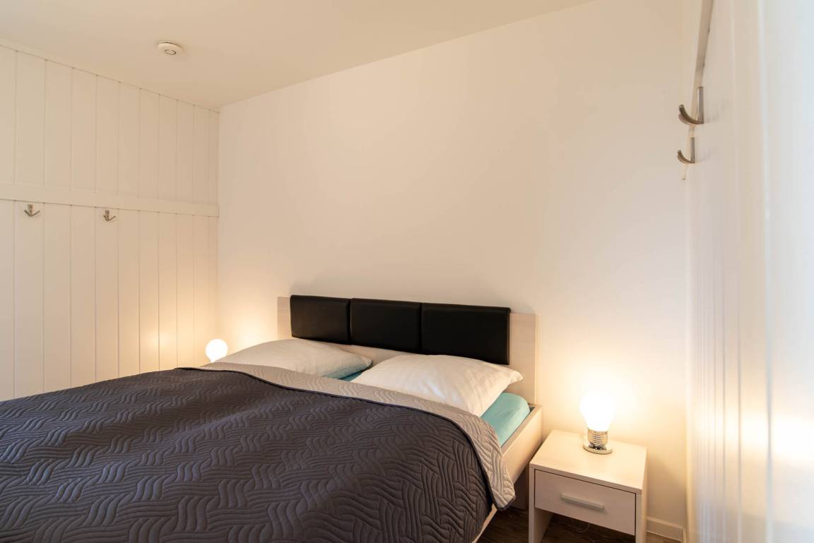 Der Schlafbereich mit einem gemütlichen Doppelbett (180x200) ist durch eine Wand vom Wohnraum abgetrennt. In einem separaten Zimmer gibt es einen Schreibtisch und ein Einzelbett (90x200) für eine dritte Person. Dieser Raum kann mit Plissees abgedunkelt werden. Das moderne Badezimmer verfügt über eine große Walk-in-Dusche, einen großen Spiegel und eine Handtuchheizung. Vom Balkon aus hat man einen wunderbaren seitlichen Meerblick über die Strander Bucht. Dort steht ein Tisch mit drei Stühlen zur Verfügung.