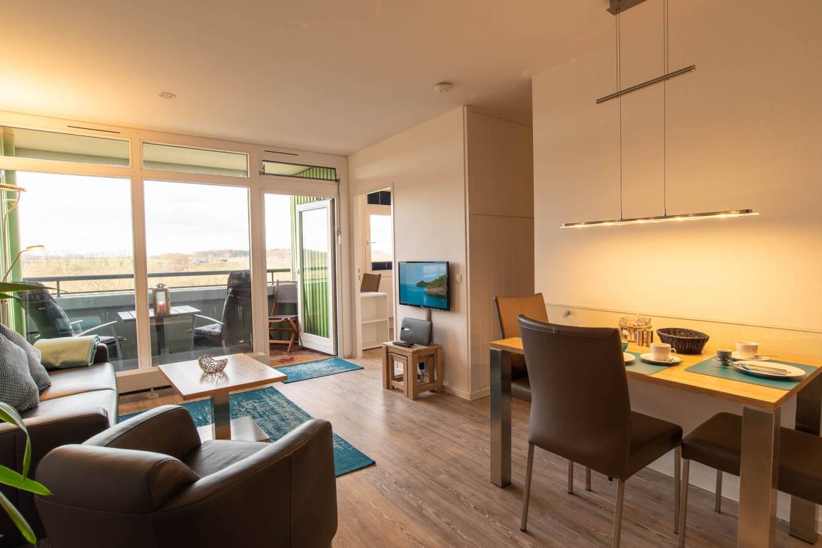 Diese 47qm große, 2-Zimmer Ferienwohnung mit seitlichem Meerblick bietet Platz für bis zu 3 Personen und befindet sich im 4. Stock des Olympia Hotel Schilksee. Die Wohnung wurde komplett renoviert und ist modern und geschmackvoll eingerichtet. Sie ist bequem mit dem Fahrstuhl erreichbar. Der offene Wohn- und Essbereich ist lichtdurchflutet und verfügt über eine komfortable Leder-Couch, einen Ledersessel, einen LCD-Fernseher und einen Esstisch für drei Personen. Durch Gardinen kann der Raum abgedunkelt werden. Die angrenzende Küche ist mit einem Induktionskochfeld, einem separaten Backofen auf Griffhöhe, einer Kühl- Gefrierkombination und einem Geschirrspüler ausgestattet. Auch eine Kaffeemaschine, ein Toaster und ein Wasserkocher sind vorhanden.