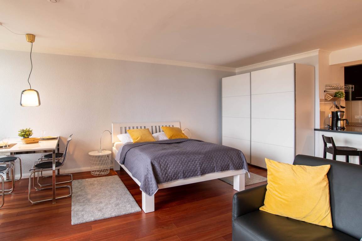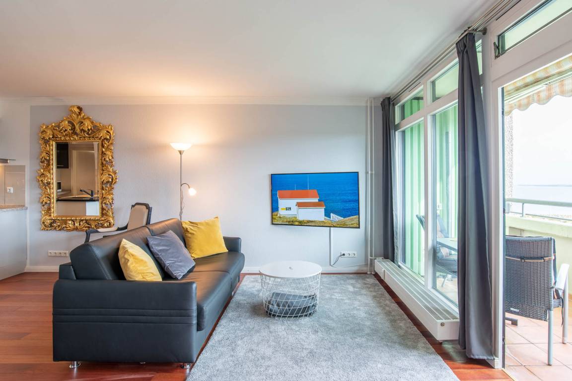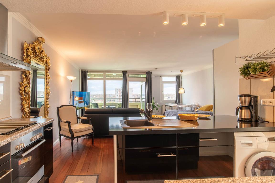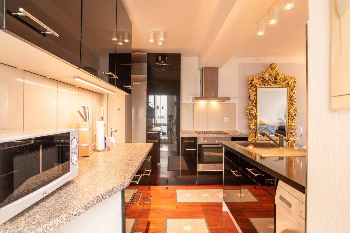Im ganzen Appartment ist ein hochwertiger, schöner Holzfußboden verlegt worden, der sofort ins Auge sticht. Ein weiterer Eyecatcher und das Accessoire der Wohnung ist der imposante Spiegel aus Gold. Er trennt den Küchenbereich vom gemütlichen Wohnbereich. Die Wohnecke besteht aus einer bequemen Ledercouch, die sich auch zu einer Schlafmöglichkeit (140x200cm) für eine dritte Person umbauen lässt. Ein großer Flachbild-Fernseher, ein Sessel und ein Teppich runden den Bereich ab, dass er zum Wohlfühlen einlädt.