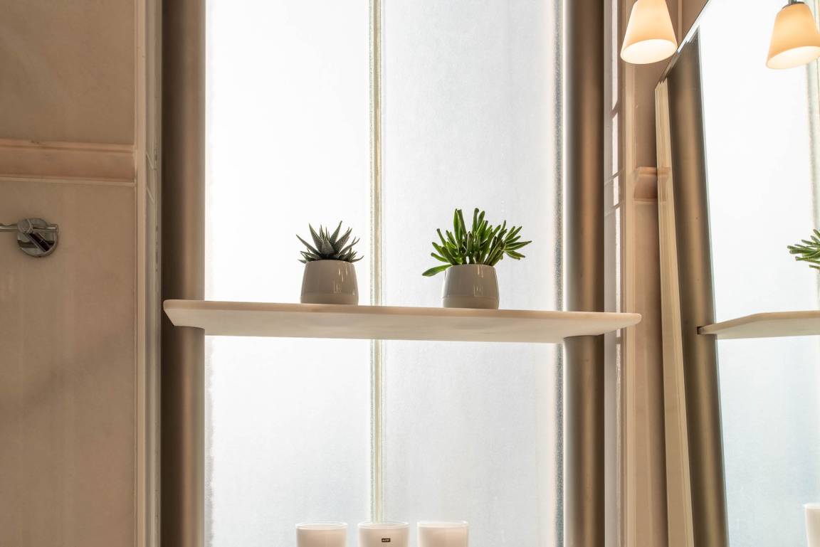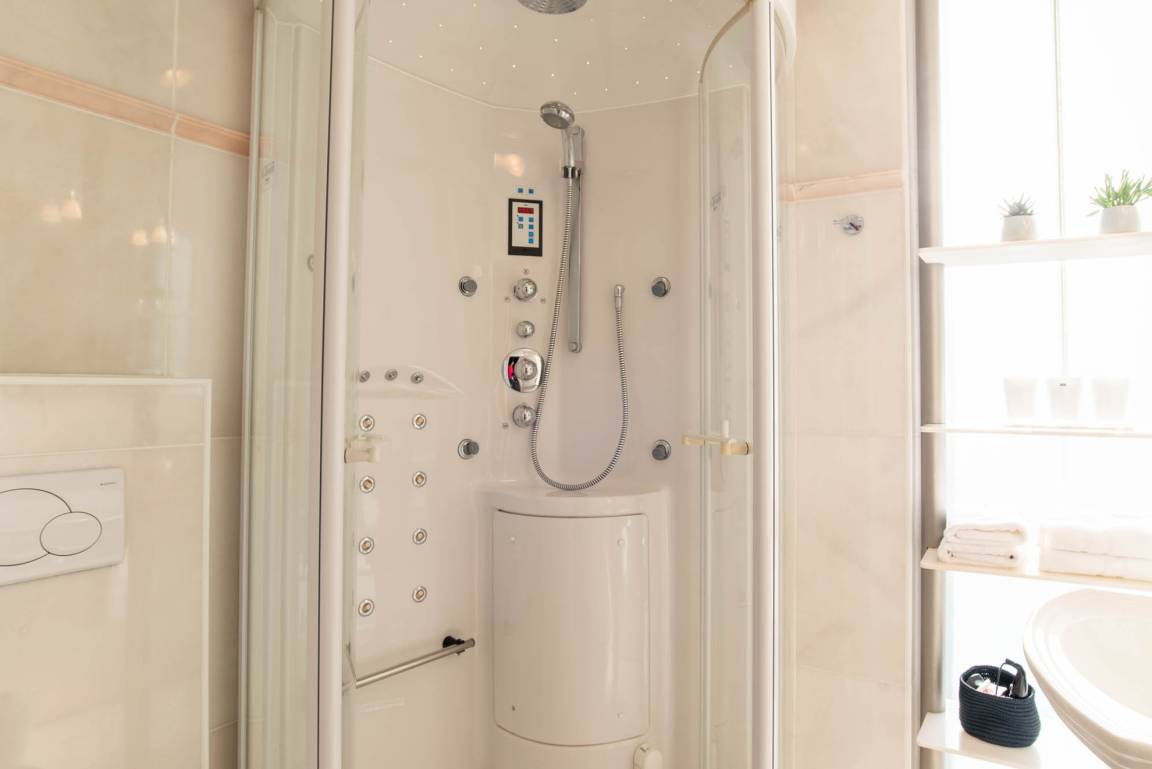 Das Badezimmer besticht neben einem Waschbecken und einem WC durch eine Handtuchheizung und einer Dampfregendusche.