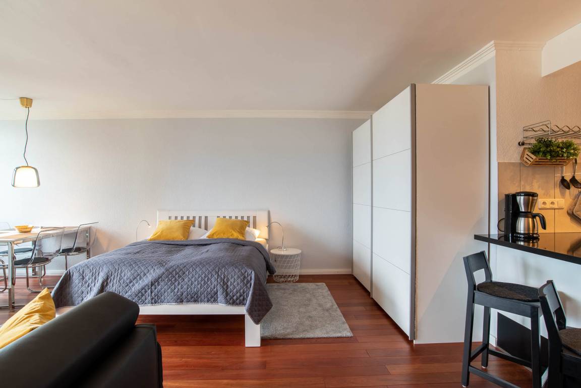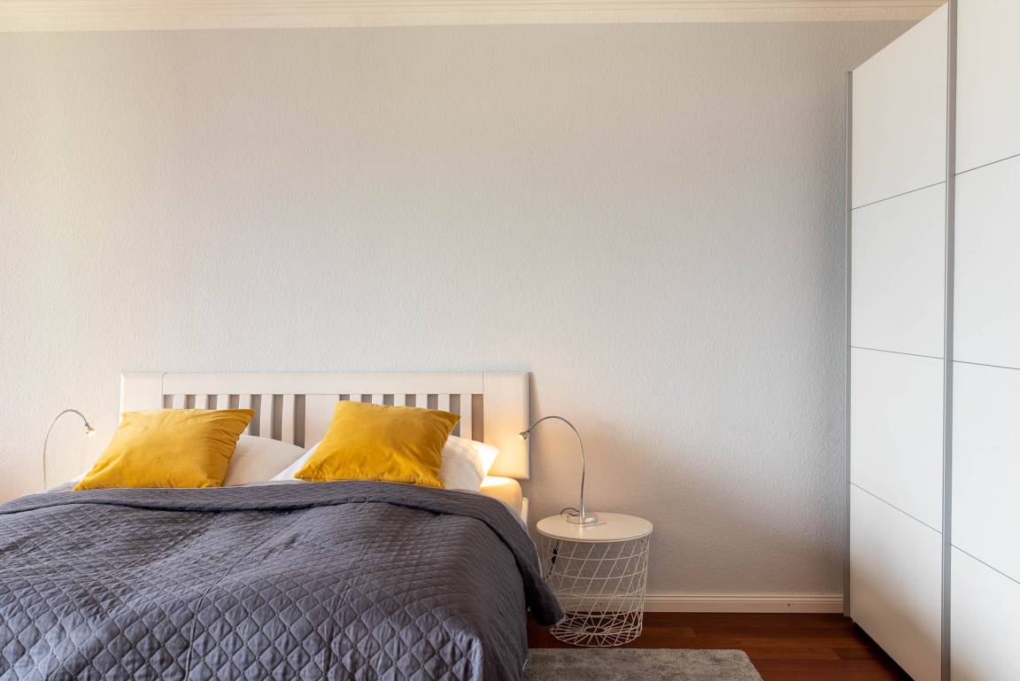 Gegenüber befindet sich der Schlafbereich mit einem Bett in den Maßen von 160cm x 200cm und einem großen Kleiderschrank. Das Appartement lässt sich mit Vorhängen verdunkeln.