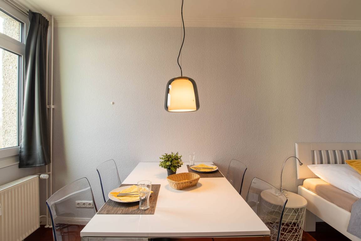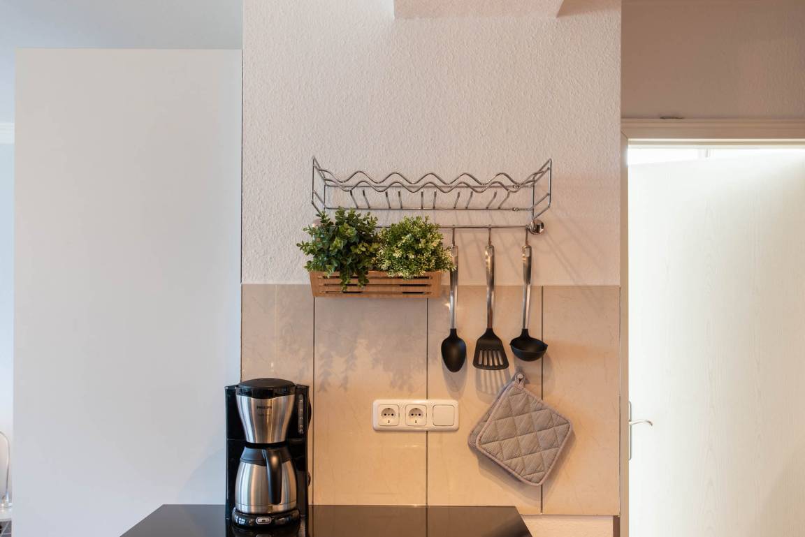 Beim Betreten dieser Wohnung erleben Sie direkt den Charme einer Loftwohnung: Im Eingangsbereich befindet sich eine moderne Hochglanzküche. Im chicen schwarz glänzt diese Küchenlandschaft nicht nur durch ihr Äußeres. Neben der funktionalen Grundausstattung, wie einem großen Kühlschrank mit Gefrierfach, einer Geschirrspülmaschine, einer Mikrowelle und einer Waschmaschine, verfügt diese geräumige, offene Küche über eine Kochinsel mit Barhockern. Hier können Sie gemütliche Kochabende in toller Atmosphäre stattfinden lassen. Aber auch ein Esstisch mit 4 Stühlen steht Ihnen zur Verfügung. Dieser befindet sich im kleinen Erker der Ferienwohnung.
