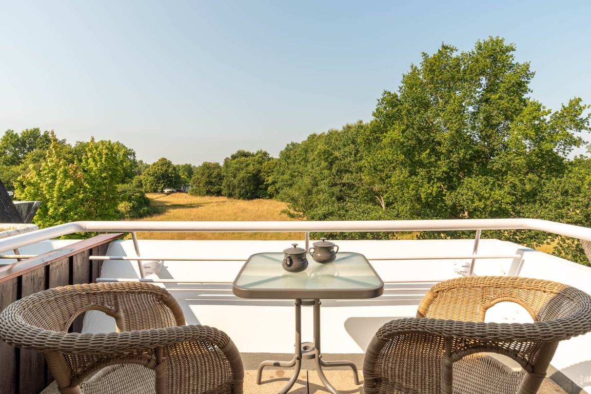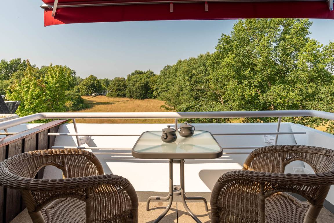 Ein Esstisch mit drei Stühlen bietet eine angenehme Sitz-, und Aufenthaltsmöglichkeit. Aber auch der Balkon ist mit zwei Stühlen, einem Tisch und einer Markise gut ausgestattet. Genießen Sie bis in den Abend hinein die Sonne und den entspannenden Blick ins Grüne.
