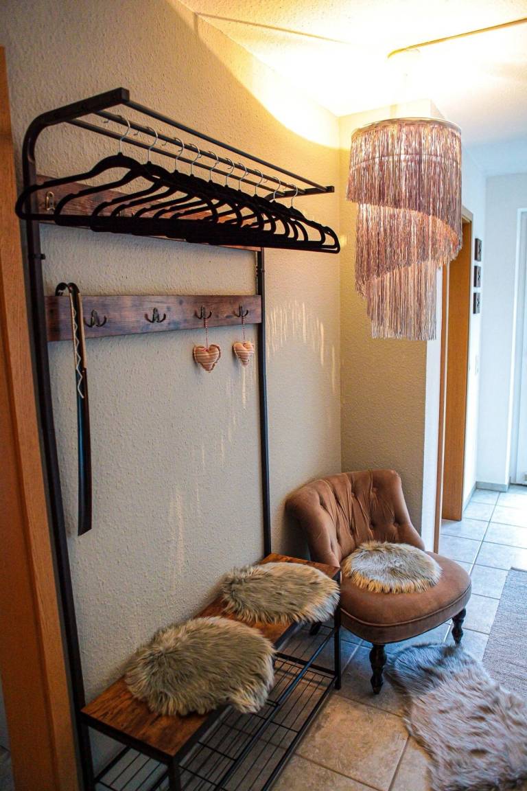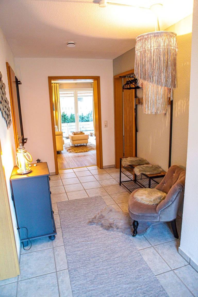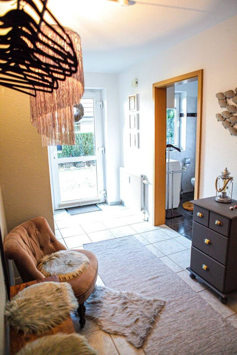 Die Wohnung hat einen separaten Eingang, liegt im Erdgeschoss und hat eine teilweise überdachte Terrasse. Dort lädt das Mobiliar zum Entspannen ein. Von dort aus erschließt sich ein Blick in den gepflegten Garten mit anschließendem Waldstück.