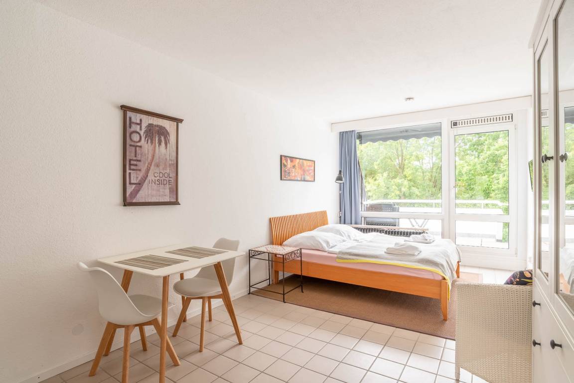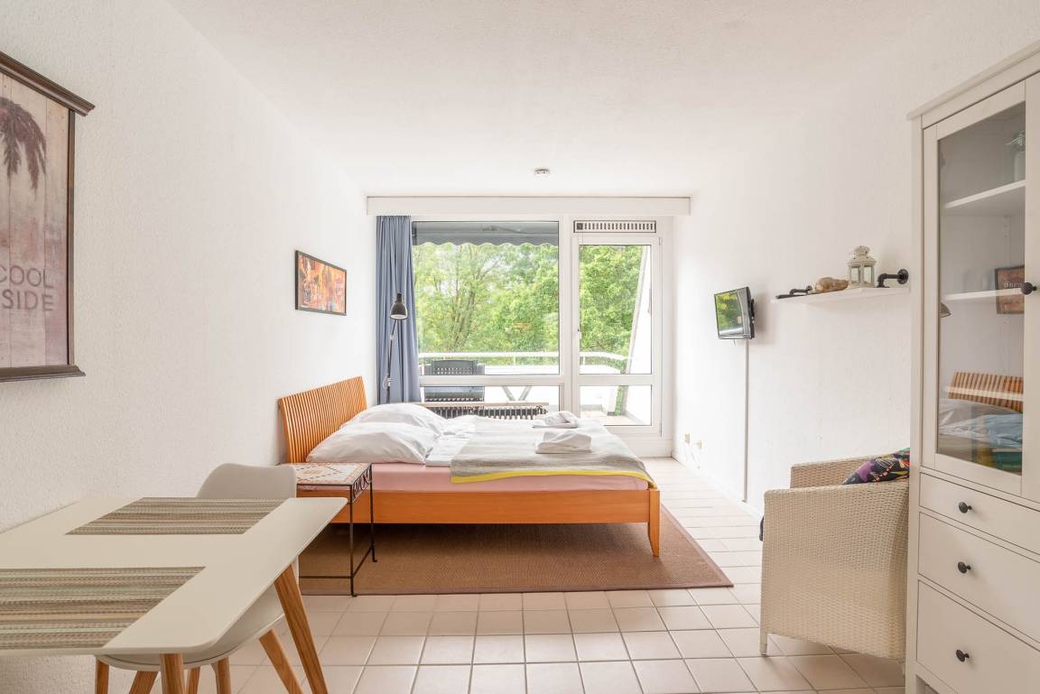 Die 1-Zimmer-Wohnung ist freundlich eingerichtet. Beim Betreten der Wohnung gelangen Sie zuerst in einen kleinen Flur mit Möglichkeiten Ihr Gepäck zu verstauen. Von hier aus erreichen Sie das voll ausgestattete Badezimmer, sowie den Wohn-, Ess-, und Schlafbereich. Das Apartment lässt sich bei Bedarf mit Gardinen abdunkeln. Zum Übernachten steht Ihnen ein Doppelbett (Liegefläche von 160 x 200 cm) zur Verfügung. Neben einer Vitrine, die ausreichend Stauraum bietet und einem Sessel ist zudem ein kleiner Flatscreen-Fernseher in diesem Apartment für Sie vorhanden.