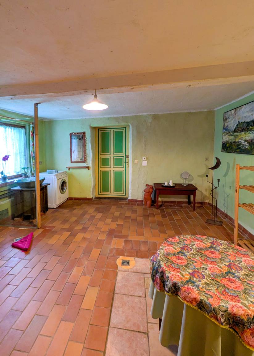 Die Wohnküche? Geräumig genug, um sich nicht gleich auf die Füße zu treten – und vollgestopft mit allem, was du brauchst. Der Esstisch ist groß. Richtig groß. Ideal für gemeinsame Mahlzeiten oder um einfach mal weit weg von den Plagen zu sitzen.
