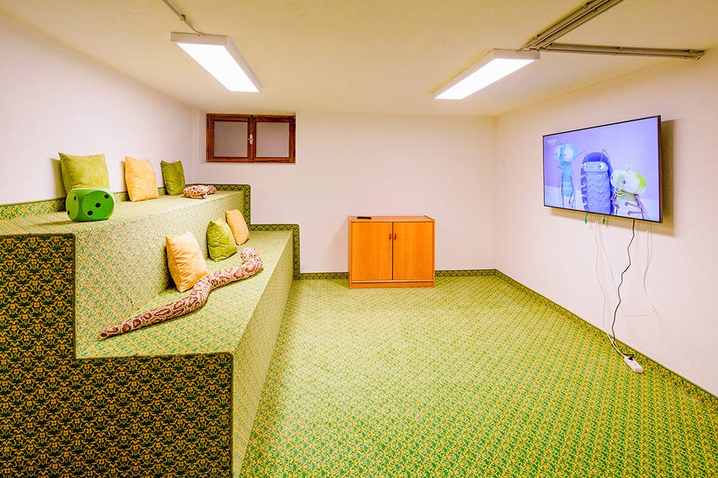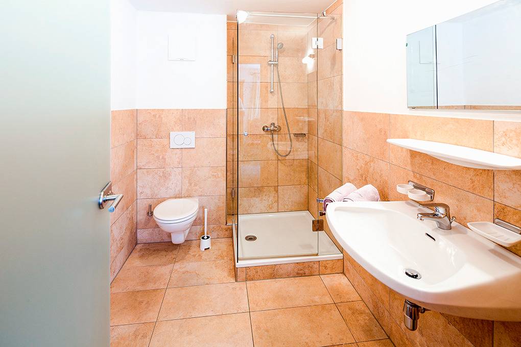 Parterre: Heller, freundlicher Aufenthaltsraum mit Esstischen, Flachbild-Sat-TV. Gut ausgestattete Gruppenküche mit Backofen, Spülmaschine, Tiefkühltruhe. 2 Doppelzimmer mit Bad. 2 separate WC. Hübscher Wellnessbereich mit Sauna, Dusche, Ruheliegen, sichtgeschützter Terrasse.