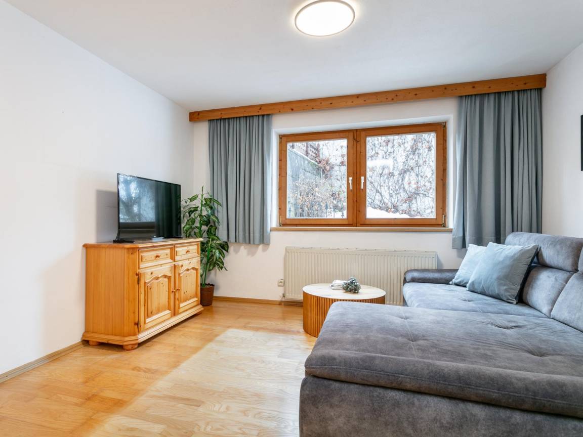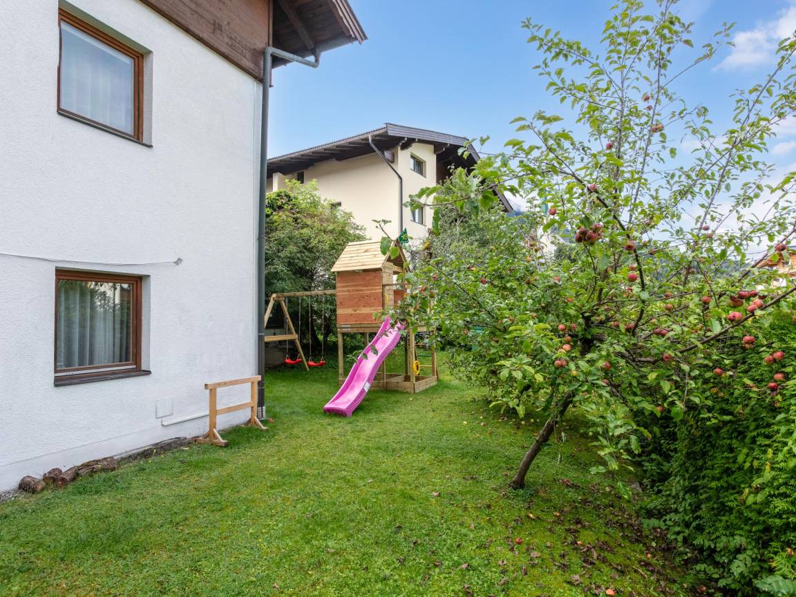 Hausbeschreibung : Dieses gemütliche Apartment bietet Platz für 6 Personen. Es ist ausgestattet mit zwei Schlafzimmern, einem Badezimmer, separatem WC sowie einem geräumigen Wohnzimmer mit offener Küche und Doppelschlafcouch (ideal für 2 Kinder). Entspannen Sie hier oder im gemeinschaftlich genützten Garten und genießen Sie die sonnige und zentrale Lage inmitten der Tiroler Bergwelt. In nur 270 m sind Sie bei der Bushaltestelle ins Skigebiet, wie auch in wenigen Minuten erreichen Sie Shops, Restaurants und Bars