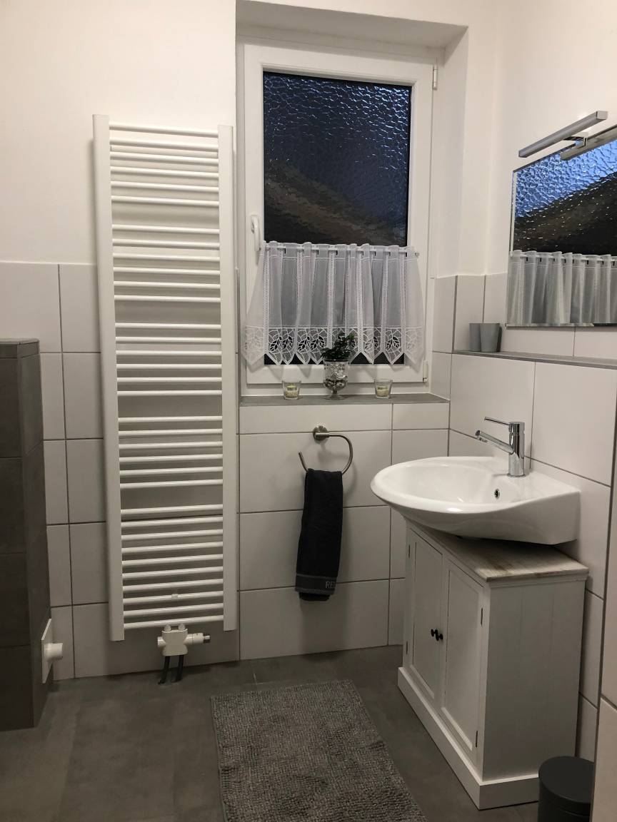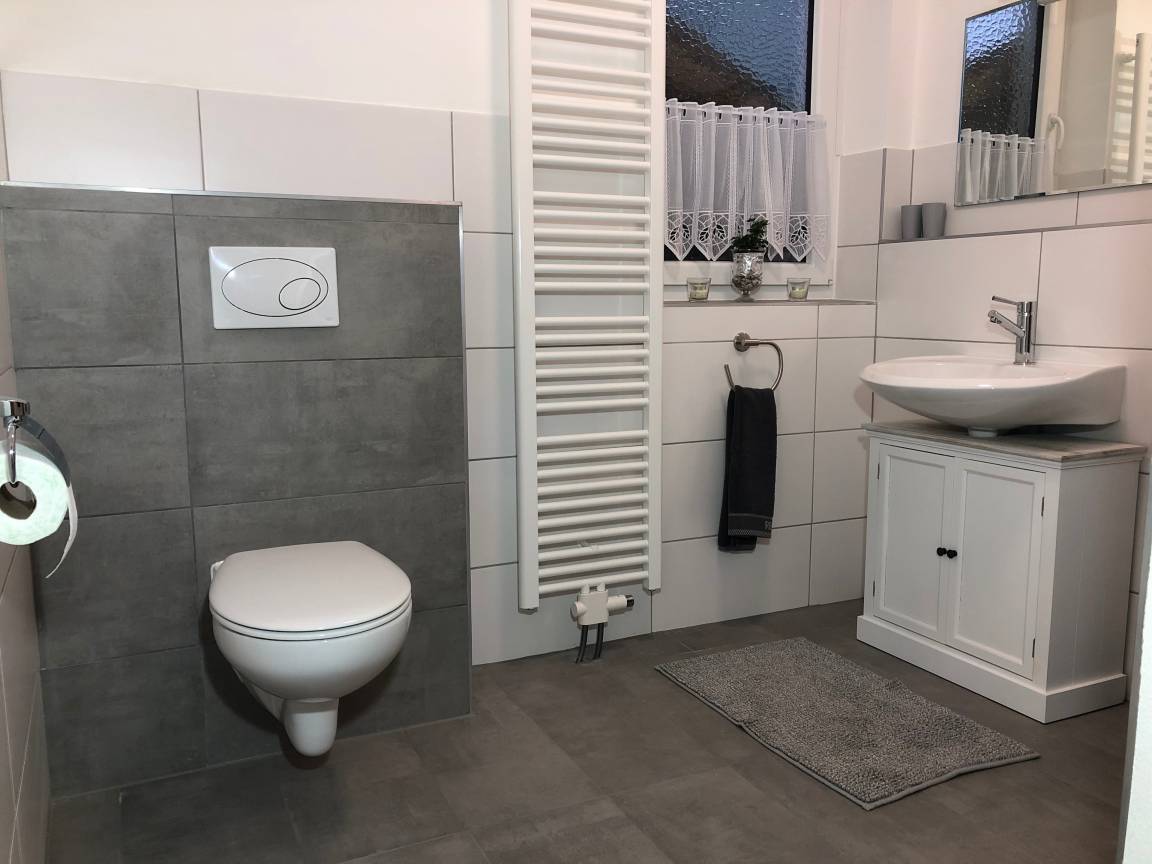 Eine weitere Besonderheit der Ferienwohnung ist das große helle Badezimmer, das mit Fußbodenheizung, einer (echten) Regendusche mit GROHE Thermostat-Armatur und einem spülrandlosen Wand-WC von GROHE ausgestattet ist. Weiterhin befindet sich ein Föhn im Badezimmer. Handtücher und Handseife werden Ihnen für Ihren Aufenthalt gestellt.