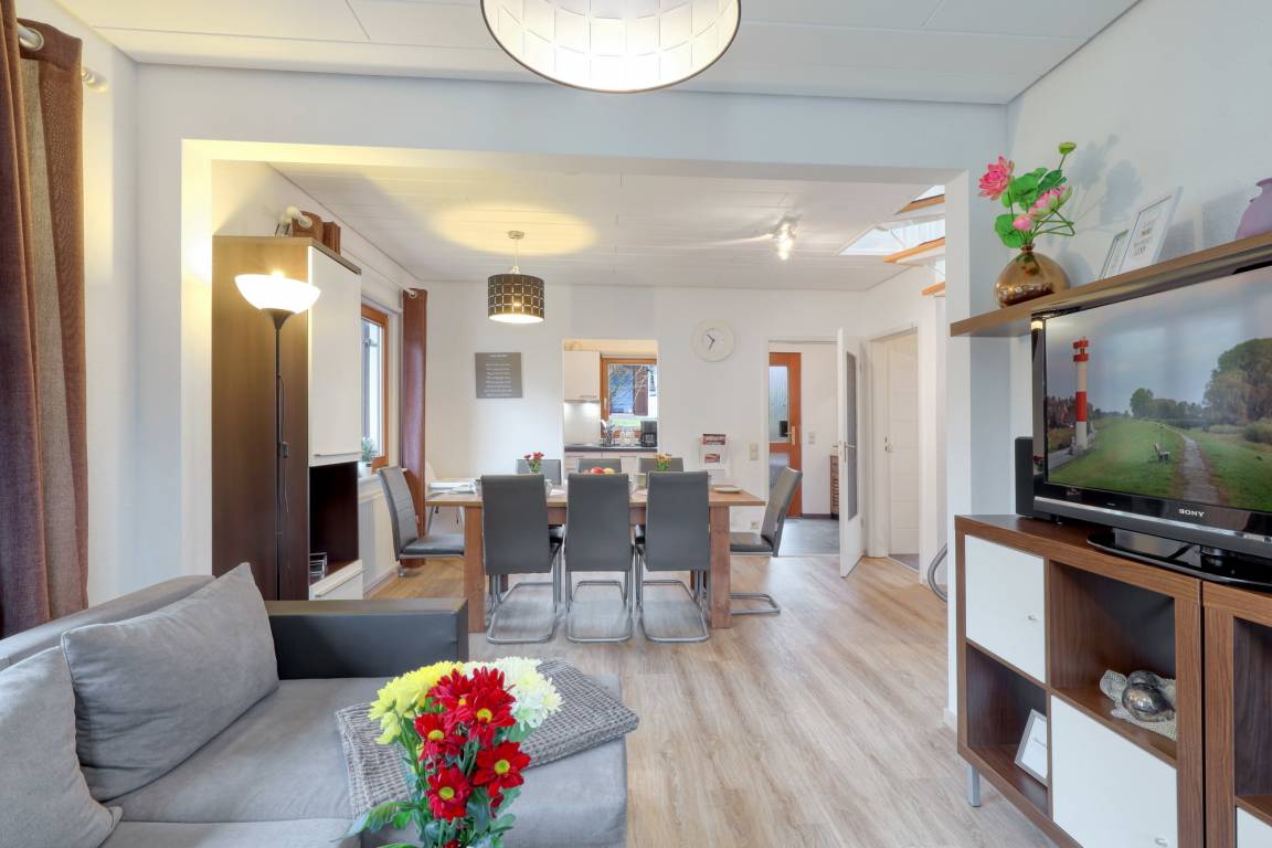 Es bietet einen großen Wohnraum mit hochwertiger Ausstattung - Großer Fernseher, DVD-Player, E-Kamin, Couch und Sessel.