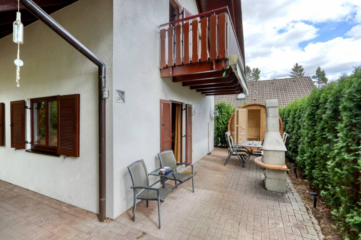 Auf der Terrasse steht Ihnen ein Grillkamin für gemütliche Abende zur Verfügung. Von der Terrasse betreten Sie die Sauna, wo Sie jederzeit ungestört entspannen können.