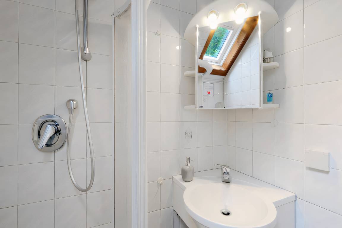 Das Bad ist mit einer Dusche und WC ausgestattet. Damit man sich morgens nicht in die quere kommt gibt es noch ein separates Gäste WC im Haus. Beide verfügen über Tageslicht sowie einen Handtuchheizkörper im Badezimmer. Die Schlafzimmer im Dachgeschoss bieten Dir einen direkten Zugang zum Süd-Balkon und jeweils ein zusätzliches Waschbecken.