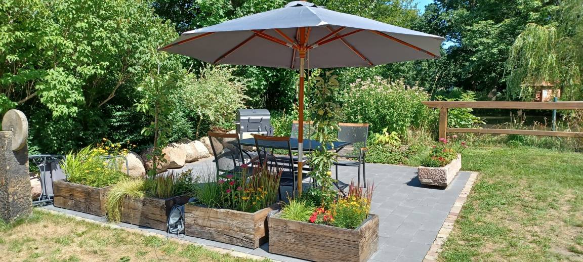 Direkt am Teich stehen eine Terrasse und ein Grillplatz zur Verfügung. Die Leihfahrräder sind im Mietpreis enthalten und sind ideal zur Erkundung der Region. Kinder können in der direkten Nachbarschaft Ponyreiten.