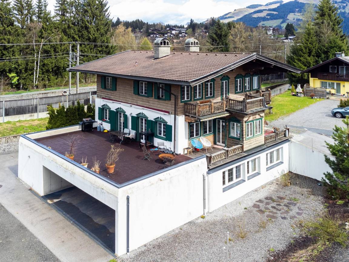 In einem ruhigen, idyllischen Wohngebiet von Kitzbühel gelegen, bietet dieses Chalet eine entspannte Atmosphäre. Die Gondelstationen Hahnenkamm und Fleckalmbahn sind bequem innerhalb von 3,0 km erreichbar, während der Skibus nur wenige Gehminuten entfernt ist. Ein Paradies für Skifans! Von der Terrasse mit Feuerstelle aus genießen Sie einen atemberaubenden Blick auf die umliegenden Kitzbüheler Alpen.